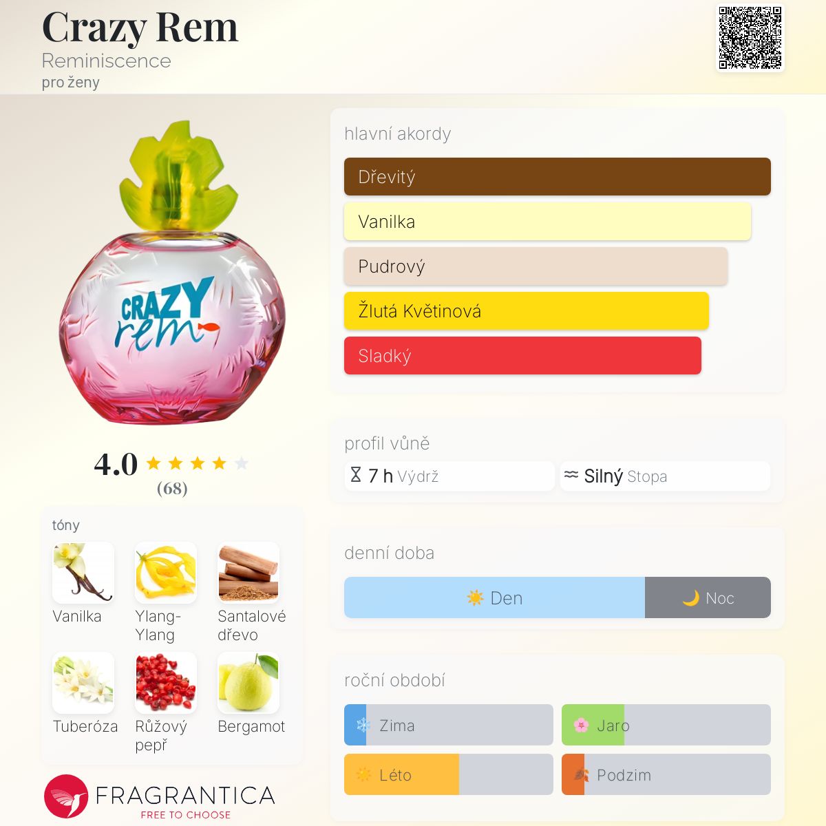 Crazy Rem podle Reminiscence je Floral Aquatic vůně pro ženy. Crazy Rem byl/a uveden/a v roce 2012. "Nosem" za touto vůní je Fabrice Pellegrin. Vrchní tóny jsou Růžový pepř a Bergamot; střední tóny jsouYlang-Ylang a Tuberóza ; základní tóny jsou Vanilka, Santalové dřevo a Pižmo.