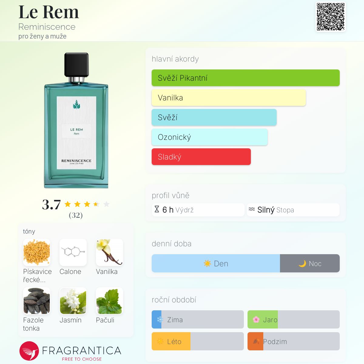 Le Rem podle Reminiscence je vůně pro ženy a muže. Toto je nová vůně. Le Rem byl/a uveden/a v roce 2024. Vrchní tóny jsou Calone, Jasmín a Šeřík; střední tóny jsouPískavice řecké seno a Pačuli ; základní tóny jsou Vanilka, Fazole tonka a Bílé pižmo.