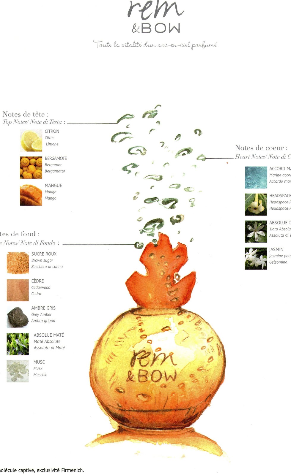 Rem & Bow podle Reminiscence je Floral Fruity vůně pro ženy. Rem & Bow byl/a uveden/a v roce 2013. Vrchní tóny jsou Mango, Grapefruit, Černý rybíz, Mandarinka, Fialkový list, Bergamot a Italský citrón; střední tóny jsouMořská voda, Plumérie, Květ tiare, Maté a Jasmín ; základní tóny jsou Pižmo, Ambra a Cedr.