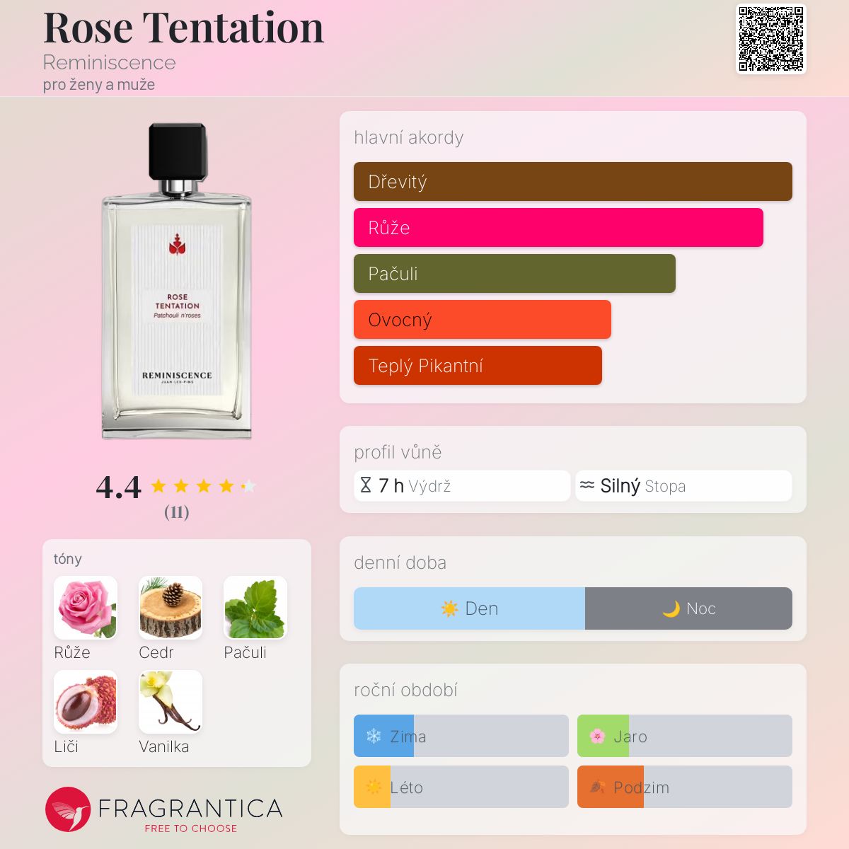 Rose Tentation podle Reminiscence je vůně pro ženy a muže. Toto je nová vůně. Rose Tentation byl/a uveden/a v roce 2024. Vrchní tóny jsou Růže a Liči; střední tóny jsouDamašská růže a Květná růže ; základní tóny jsou Cedr, Pačuli a Vanilka.