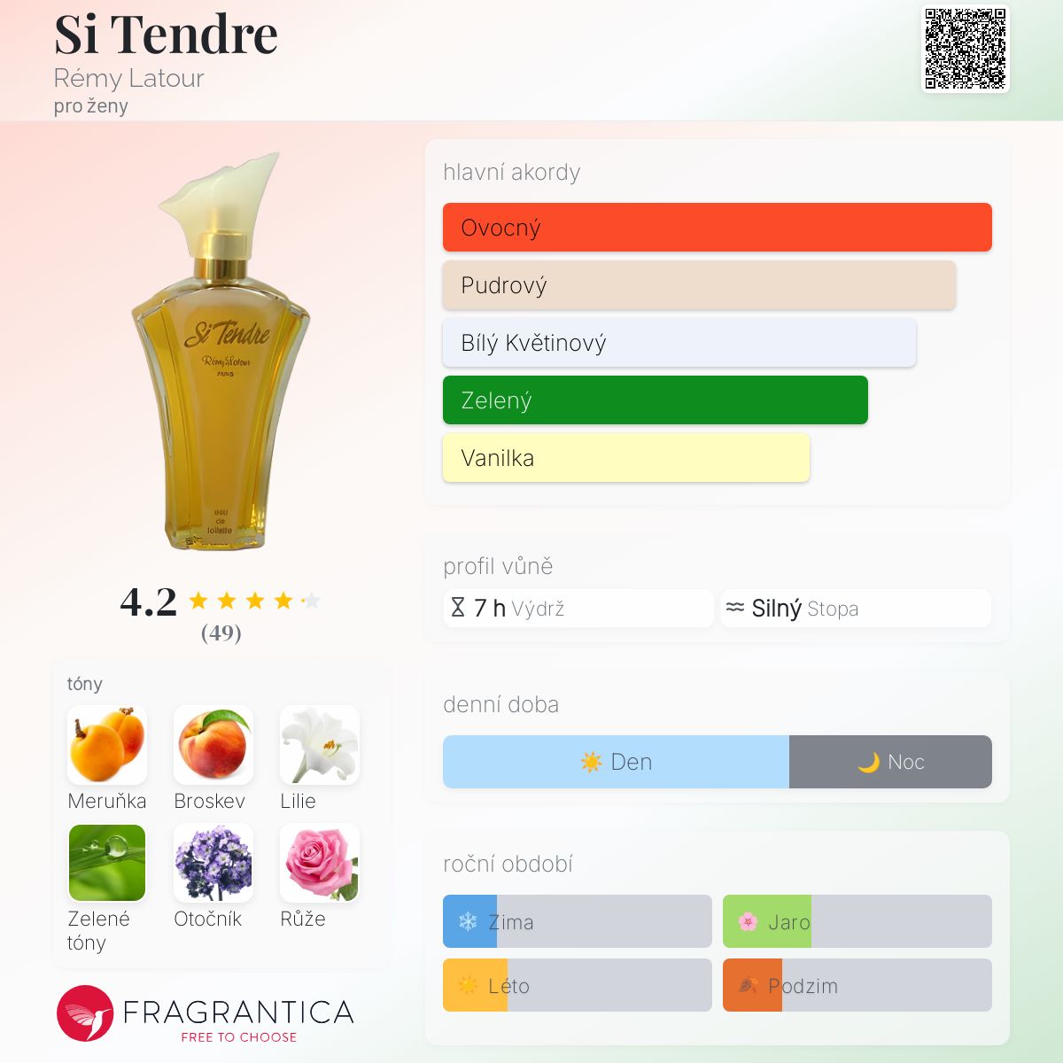 Si Tendre podle Rémy Latour je Floral Green vůně pro ženy. Si Tendre byl/a uveden/a v roce 1989. Vrchní tóny jsou Meruňka, Lilie, Zelené tóny a Fialkový list; střední tóny jsouBroskev, Otočník, Růže, Jasmín, Konvalinka a Levandule ; základní tóny jsou Jantar (ambra), Vanilka, Kořen kosatce, Dřevité tóny a Pižmo.