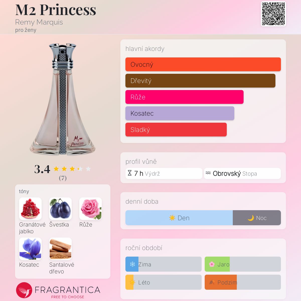 M2 Princess podle Remy Marquis je Floral Fruity vůně pro ženy. Vrchní tóny jsou Granátové jablko a Švestka; střední tóny jsouRůže a Kosatec ; základní tón je Santalové dřevo.