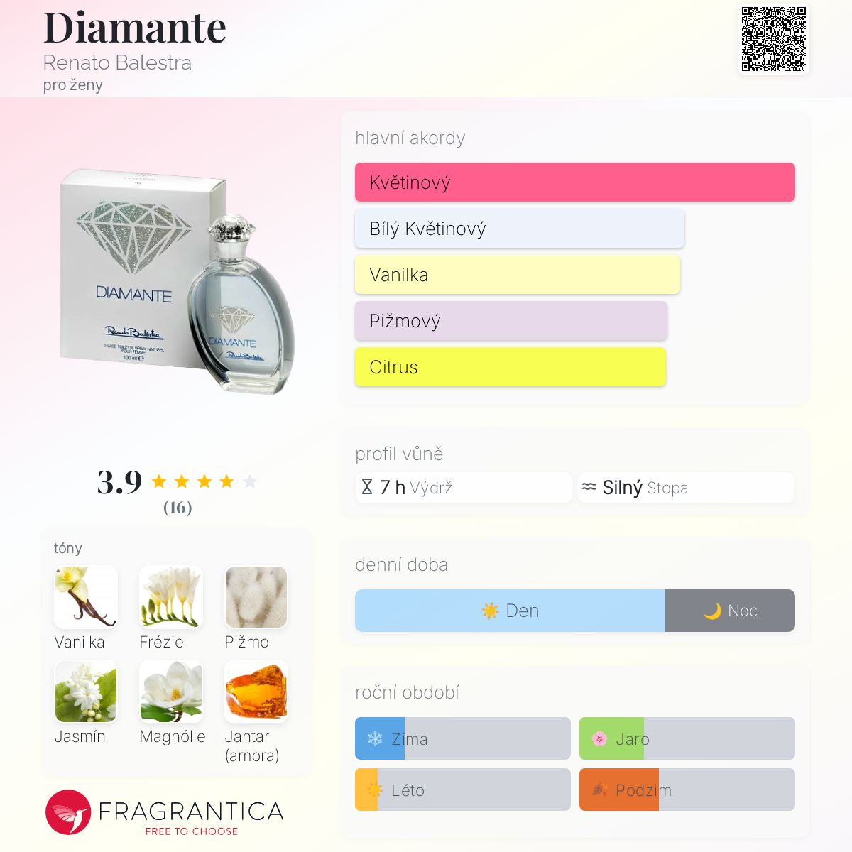 Diamante podle Renato Balestra je Orientální Floral vůně pro ženy. Diamante byl/a uveden/a v roce 2007. Vrchní tóny jsou Hruška, Bergamot, Pomeranč, Citrón a Vodní meloun; střední tóny jsouFrézie, Jasmín, Magnólie, Pomerančový květ a Okvětní lístky růží ; základní tóny jsou Vanilka, Pižmo, Jantar (ambra), Vetiver a Cedr.