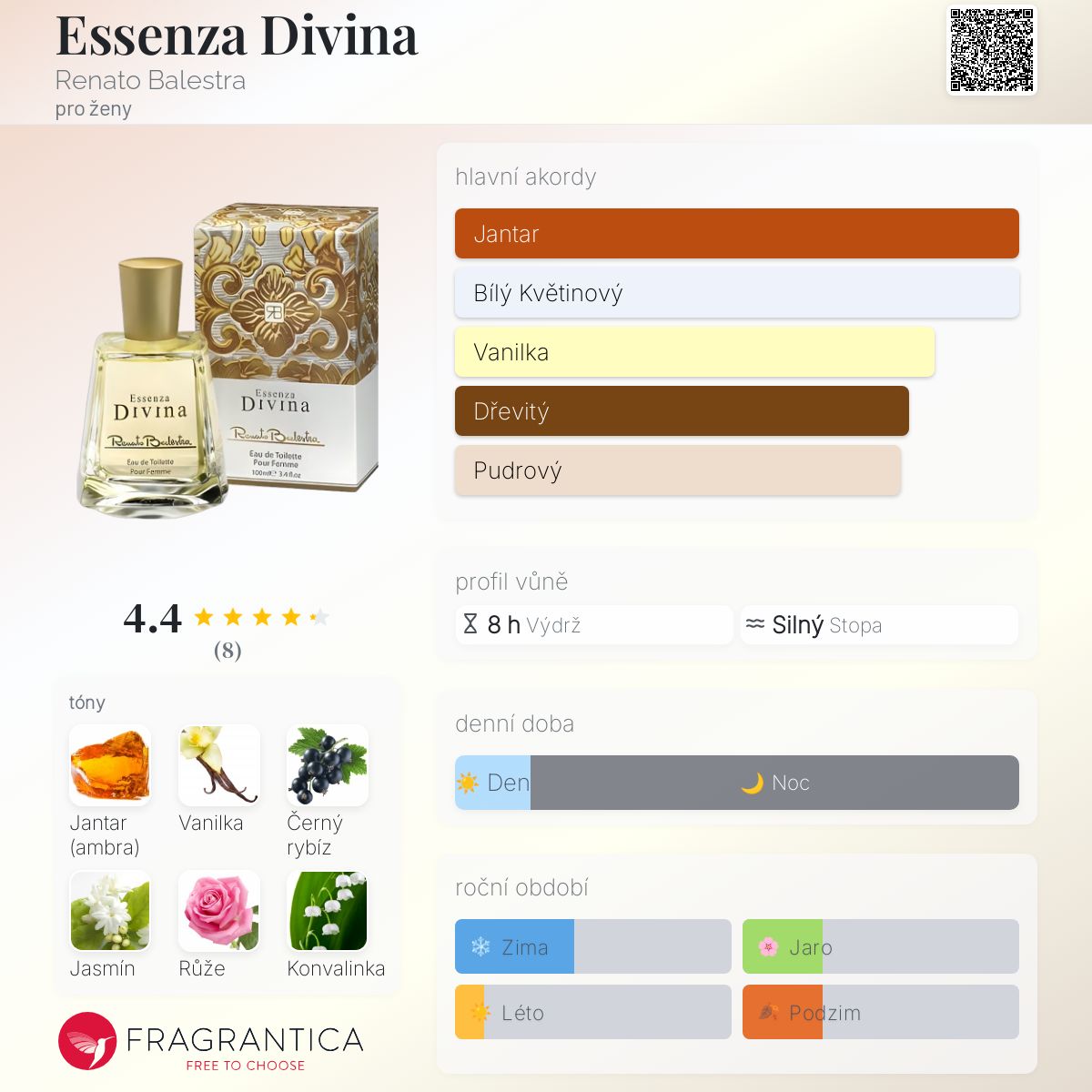 Essenza Divina podle Renato Balestra je Orientální Floral vůně pro ženy. Essenza Divina byl/a uveden/a v roce 2012. Vrchní tóny jsou Černý rybíz, Bergamot a Hřebíček; střední tóny jsouJasmín, Růže a Konvalinka ; základní tóny jsou Jantar (ambra), Vanilka a Santalové dřevo.