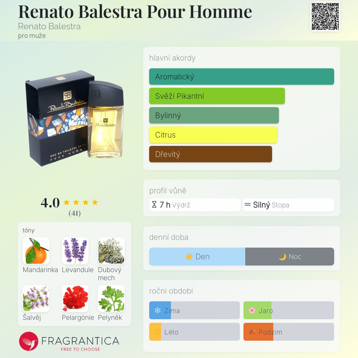 Renato Balestra Pour Homme podle Renato Balestra je Woody Chypre vůně pro muže. Renato Balestra Pour Homme byl/a uveden/a v roce 1982. Vrchní tóny jsou Mandarinka, Šalvěj, Pelyněk, Bergamot, Bazalka, Hřebíček, Tymián a Jalovcové bobulky; střední tóny jsouLevandule, Pelargónie, Virginský cedr, Karafiát, Konvalinka, Kardamom, Koriandr, Borovice, Růže a Pačuli ; základní tóny jsou Dubový mech, Pižmo, Vetiver, Kůže, Jantar (ambra), Guajakové dřevo, Amyris a Ebenový strom.
