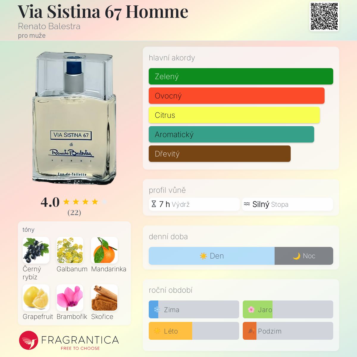 Via Sistina 67 Homme podle Renato Balestra je Aromatic Fougere vůně pro muže. Via Sistina 67 Homme byl/a uveden/a v roce 2001. Vrchní tóny jsou Černý rybíz, Mandarinka, Grapefruit, Pelyněk, Bazalka, Máta a Bergamot; střední tóny jsouGalbanum, Brambořík a Cejlonská skořice ; základní tón je Dřevité tóny.