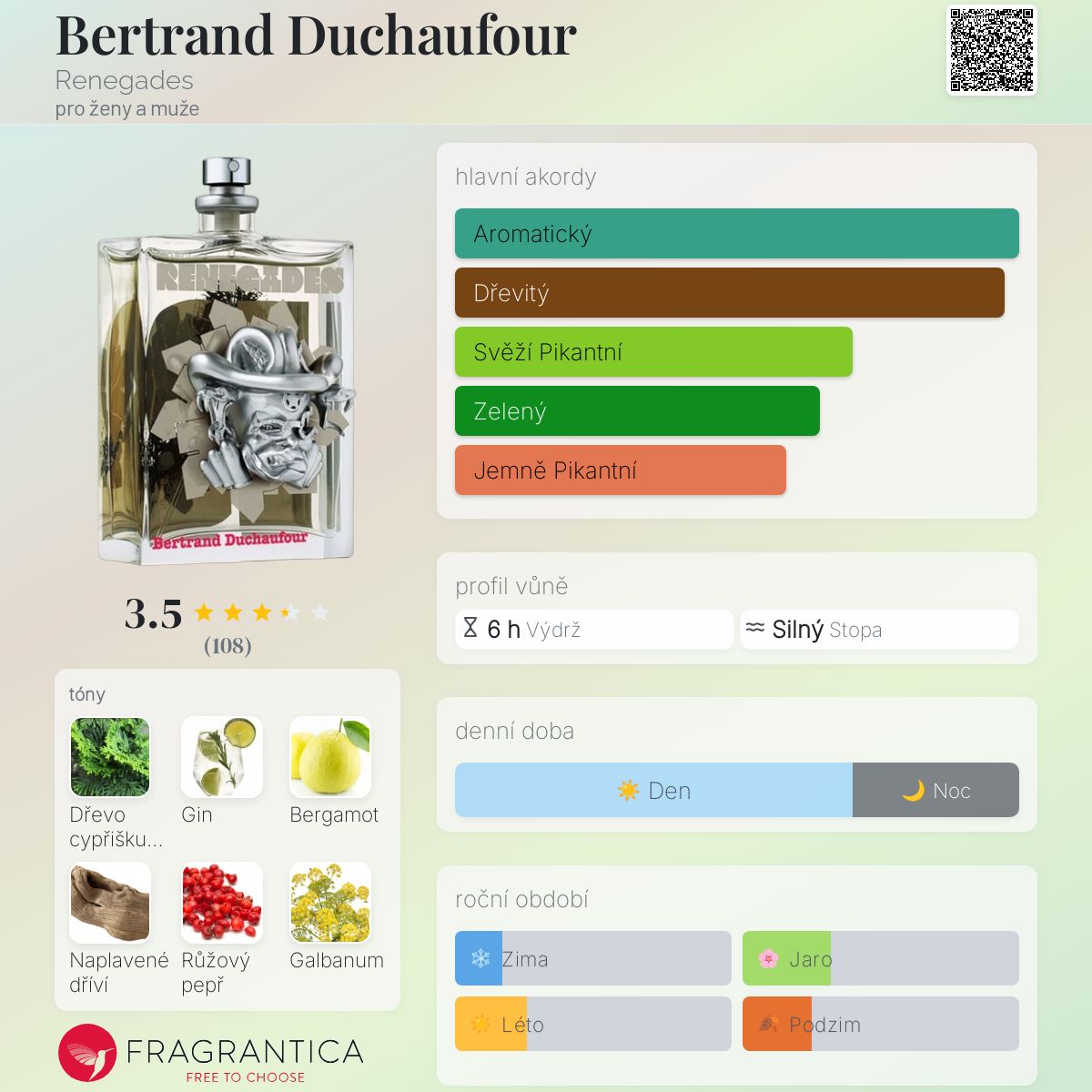 Bertrand Duchaufour podle Renegades je Aromatic Spicy vůně pro ženy a muže. Bertrand Duchaufour byl/a uveden/a v roce 2016. "Nosem" za touto vůní je Bertrand Duchaufour. Vrchní tóny jsou Gin, Bergamot, Růžový pepř, Galbanum, Černý rybíz a Kardamom; střední tóny jsouDřevo cypřišku tupolistého, Olibanum a Červené bobule ; základní tóny jsou Naplavené dříví, Jedle balzámová a Jantar (ambra).
