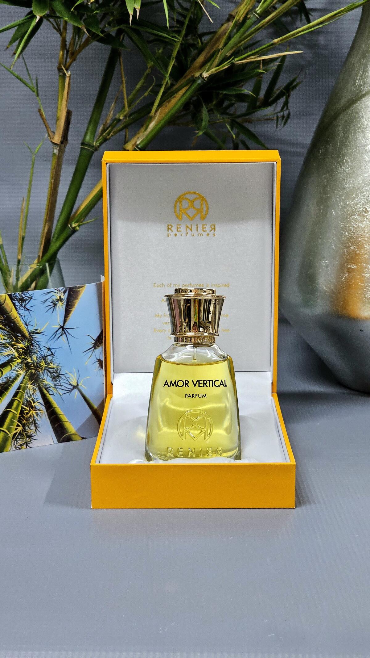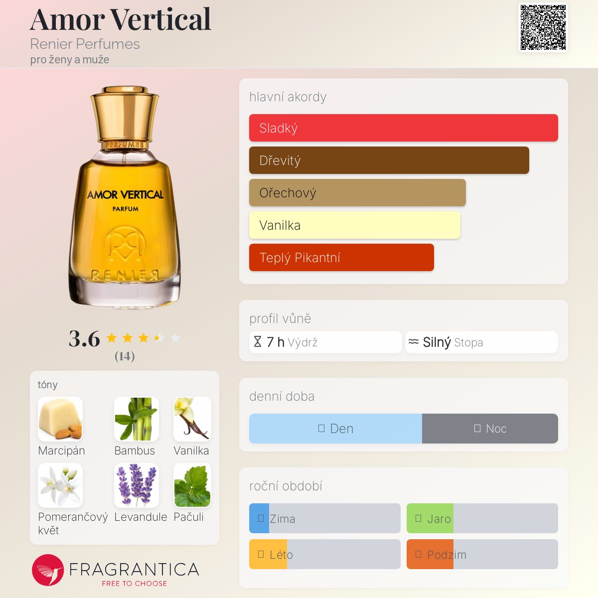 Amor Vertical podle Renier Perfumes je Woody vůně pro ženy a muže. Toto je nová vůně. Amor Vertical byl/a uveden/a v roce 2025. "Nosem" za touto vůní je Renier R. Mendez. Vrchní tóny jsou Pomerančový květ, Levandule, Zelené jablko a Tymián; střední tóny jsouMarcipán, Bambus, Santalové dřevo, Turecká růže a Virginský cedr ; základní tóny jsou Vanilka, Pačuli, Benzoin, Pižmo a Vetiver.