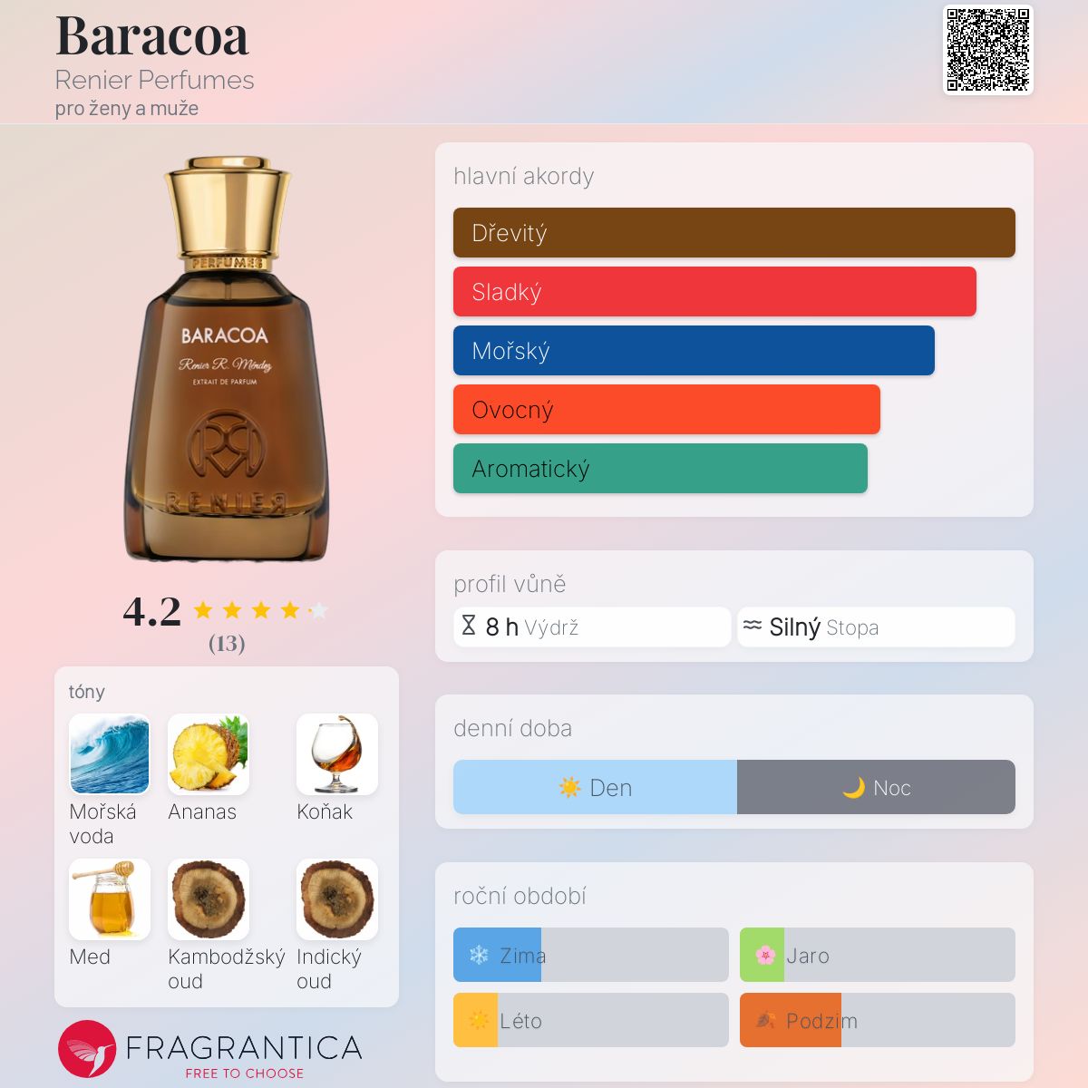 Baracoa podle Renier Perfumes je Orientální Woody vůně pro ženy a muže. Toto je nová vůně. Baracoa byl/a uveden/a v roce 2024. "Nosem" za touto vůní je Renier R. Mendez. Vrchní tóny jsou Ananas, Koňak, Med a Bergamot; střední tóny jsouKambodžský oud, Indický oud, Santalové dřevo a Růže ; základní tóny jsou Mořské tóny, Vietnamský oud, Vanilka, Jantar (ambra), Pižmo a Dubový mech.