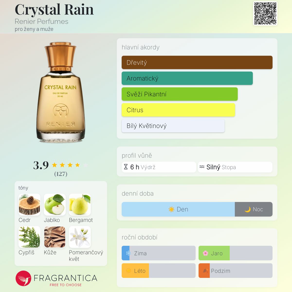 Crystal Rain podle Renier Perfumes je Floral vůně pro ženy a muže. Crystal Rain byl/a uveden/a v roce 2016. "Nosem" za touto vůní je Daniel Josier. Vrchní tóny jsou Jablko, Bergamot, Pomerančový květ a Tymián; střední tóny jsouCedr, Cypřiš a Jasmín ; základní tóny jsou Kůže, Ambra a Jantar (ambra).