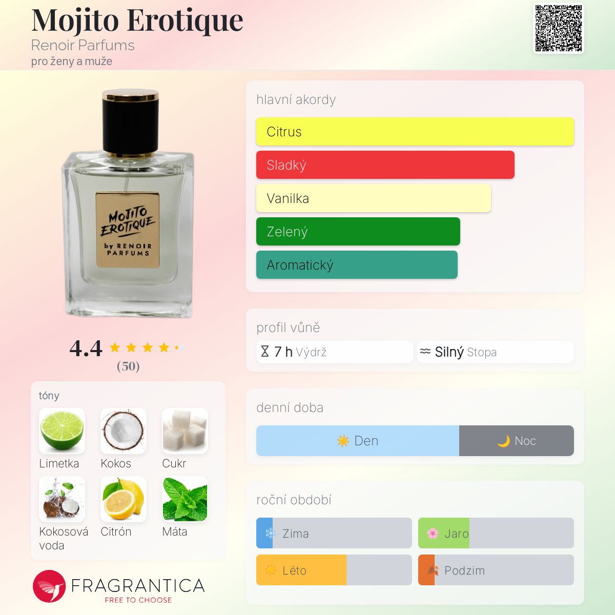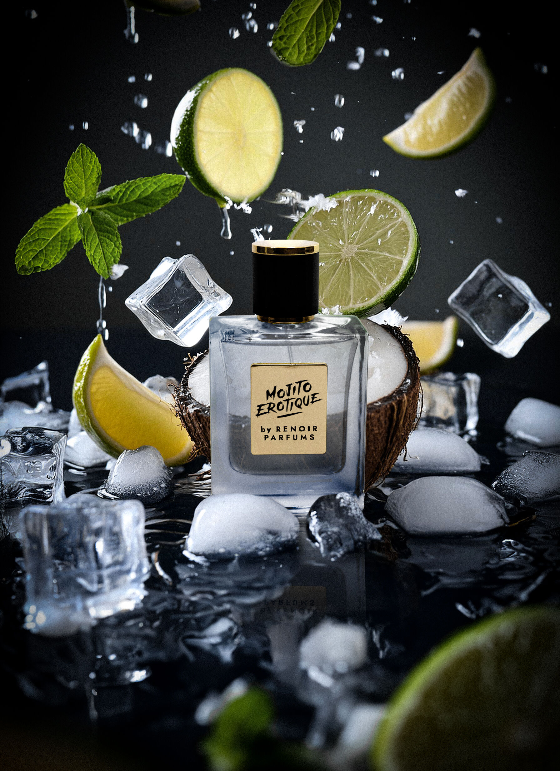 Mojito Erotique podle Renoir Parfums je Aromatic vůně pro ženy a muže. Toto je nová vůně. Mojito Erotique byl/a uveden/a v roce 2024. "Nosem" za touto vůní je Mladen Kolev. Vrchní tóny jsou Limetka, Kokos, Citronová kůra, Máta, Led, Bergamot a Hořký pomeranč; střední tóny jsouCukr, Kokosová voda a Bílý rum ; základní tóny jsou Vanilka a Pačuli.