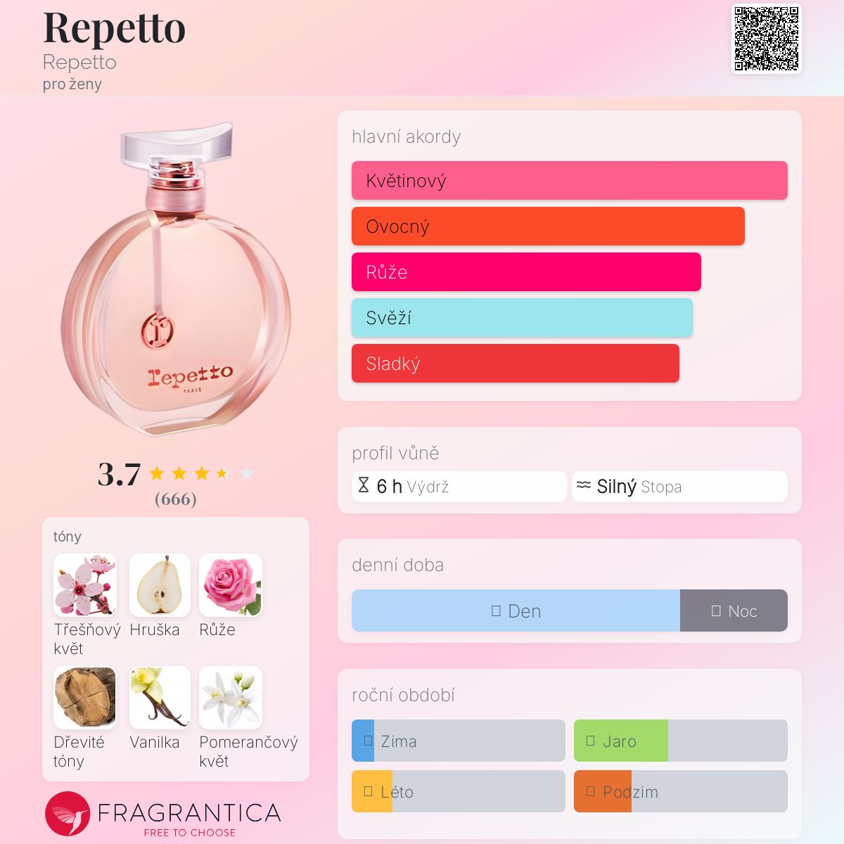 Repetto podle Repetto je Floral Fruity vůně pro ženy. Repetto byl/a uveden/a v roce 2013. "Nosem" za touto vůní je Olivier Polge. Vrchní tóny jsou Třešňový květ a Hruška; střední tóny jsouRůže a Pomerančový květ ; základní tóny jsou Dřevité tóny, Vanilkový lusk a Jantar (ambra).