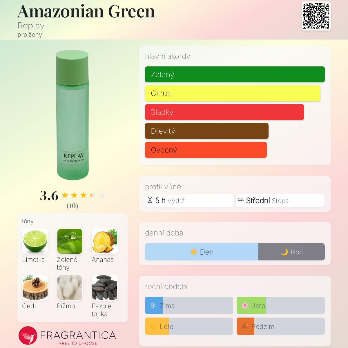 Amazonian Green podle Replay je vůně pro ženy. Amazonian Green byl/a uveden/a v roce 2022. Vrchní tóny jsou Limetka, Ananas a Růžový pepř; střední tóny jsouZelené tóny, Cedr a Kosatec ; základní tóny jsou Pižmo a Fazole tonka.