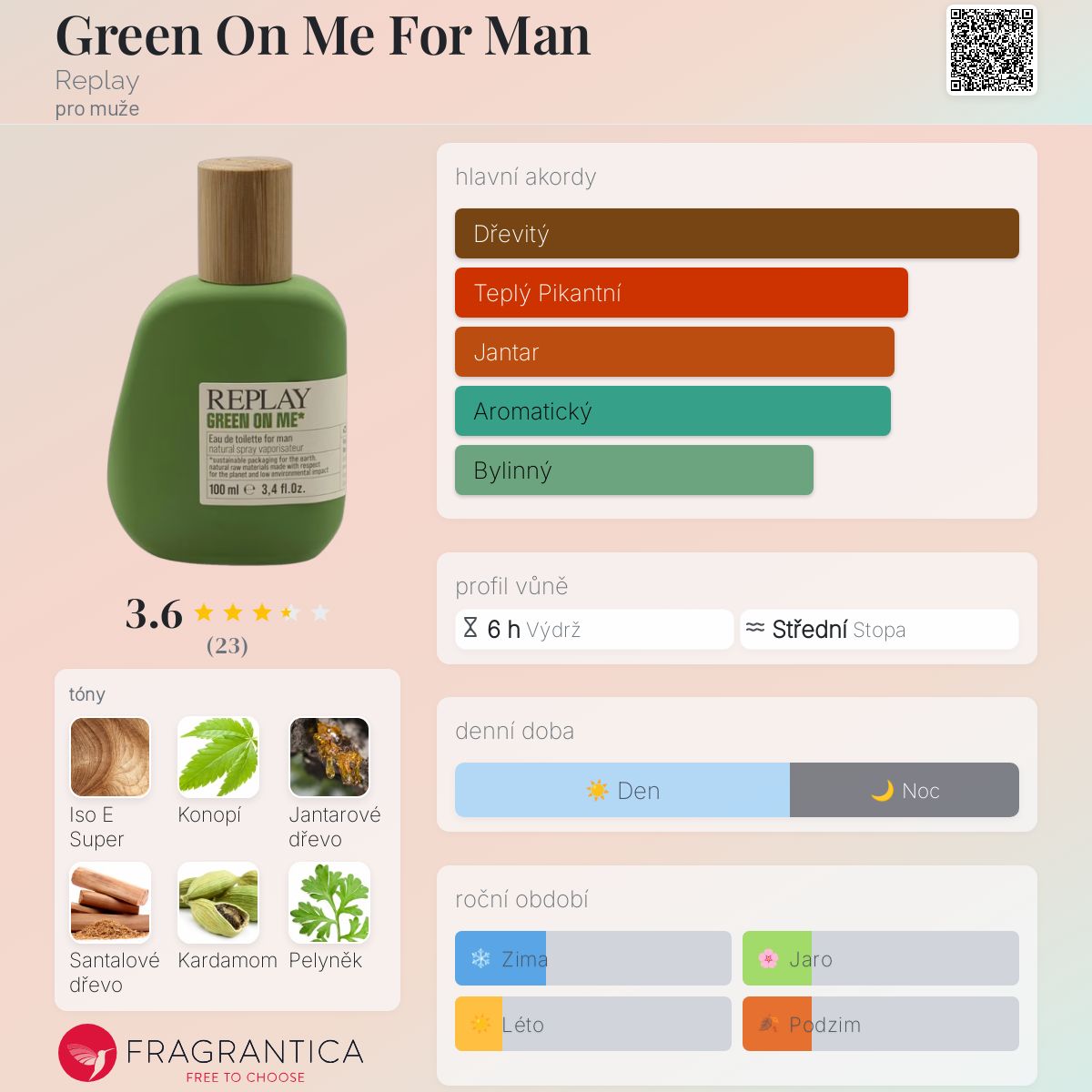 Green On Me For Man podle Replay je Woody Aromatic vůně pro muže. Toto je nová vůně. Green On Me For Man byl/a uveden/a v roce 2024. Vrchní tóny jsou Kardamom, Pomeranč a Pepř; střední tóny jsouKonopí, Pelyněk a Karafiát ; základní tóny jsou Iso E Super, Jantarové dřevo a Santalové dřevo.