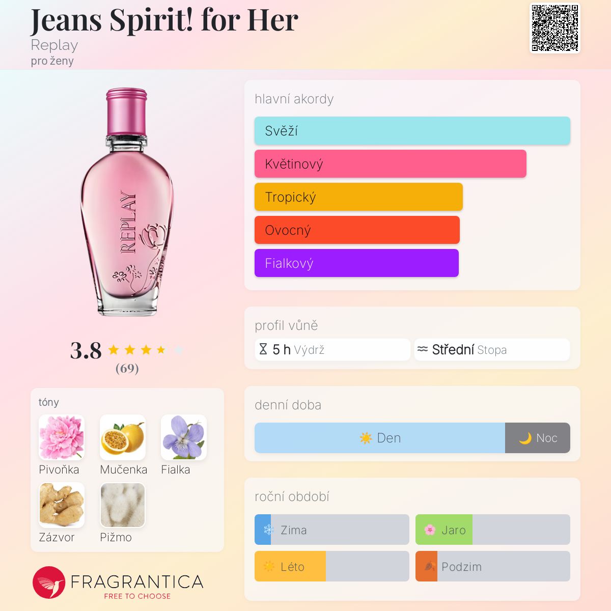 Jeans Spirit! for Her podle Replay je Floral Fruity vůně pro ženy. Jeans Spirit! for Her byl/a uveden/a v roce 2011. Vrchní tón je Pivoňka ; střední tóny jsouMučenka a Zázvor ; základní tóny jsou Fialka a Pižmo.