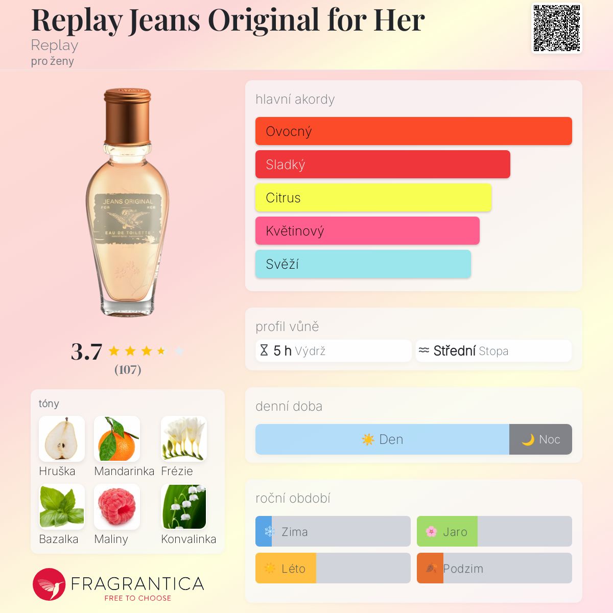 Replay Jeans Original for Her podle Replay je Floral Fruity vůně pro ženy. Replay Jeans Original for Her byl/a uveden/a v roce 2012. Vrchní tóny jsou Hruška, Mandarinka a Bazalka; střední tóny jsouFrézie, Konvalinka a Růže ; základní tóny jsou Maliny, Cedr a Pižmo.