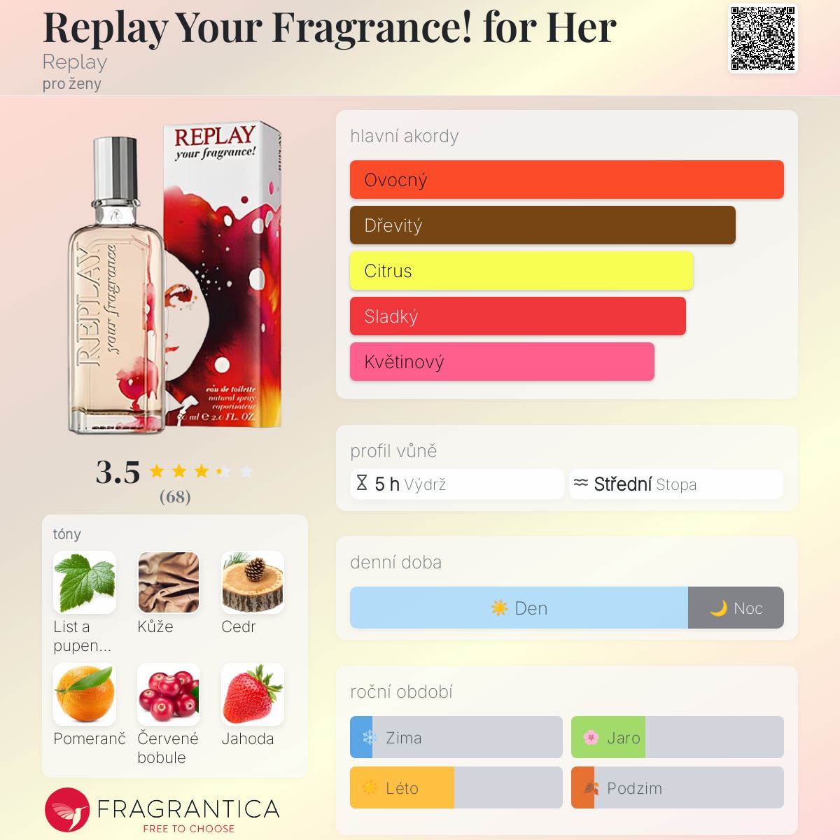 Replay Your Fragrance! for Her podle Replay je Floral Fruity vůně pro ženy. Replay Your Fragrance! for Her byl/a uveden/a v roce 2009. Vrchní tóny jsou Pomeranč, Bergamot a Frézie; střední tóny jsouČerný rybíz, Červené bobule, Velká jahoda, Růže a Orchidej ; základní tóny jsou Kůže, Virginský cedr a Santalové dřevo.