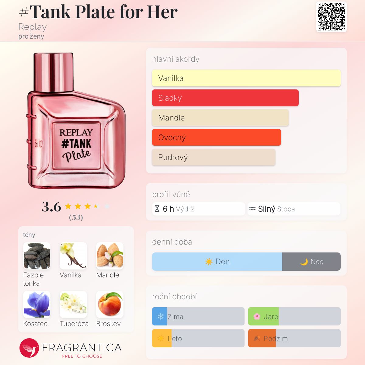 #Tank Plate for Her podle Replay je Orientální Floral vůně pro ženy. #Tank Plate for Her byl/a uveden/a v roce 2018. Vrchní tóny jsou Mandle, Červené ovoce a Frézie; střední tóny jsouKosatec, Tuberóza, Broskev a Jasmín ; základní tóny jsou Fazole tonka, Vanilka, Santalové dřevo a Jantar (ambra).