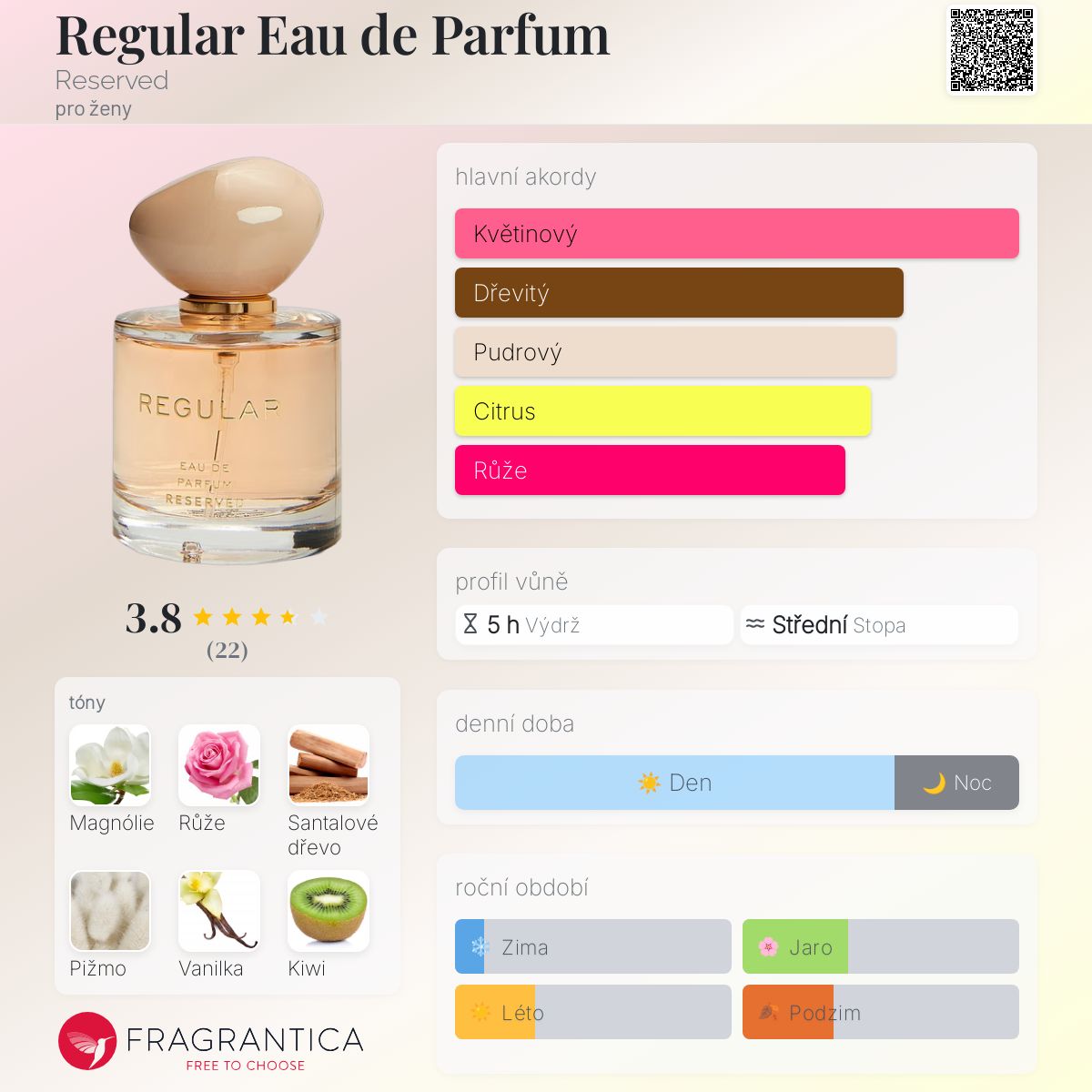 Regular Eau de Parfum podle Reserved je Floral Fruity vůně pro ženy. Regular Eau de Parfum byl/a uveden/a v roce 2020. Vrchní tóny jsou Kiwi a Mandarinka; střední tóny jsouMagnólie, Růže, Pačuli, Kadidlo a Voskovka ; základní tóny jsou Santalové dřevo, Pižmo a Vanilka.