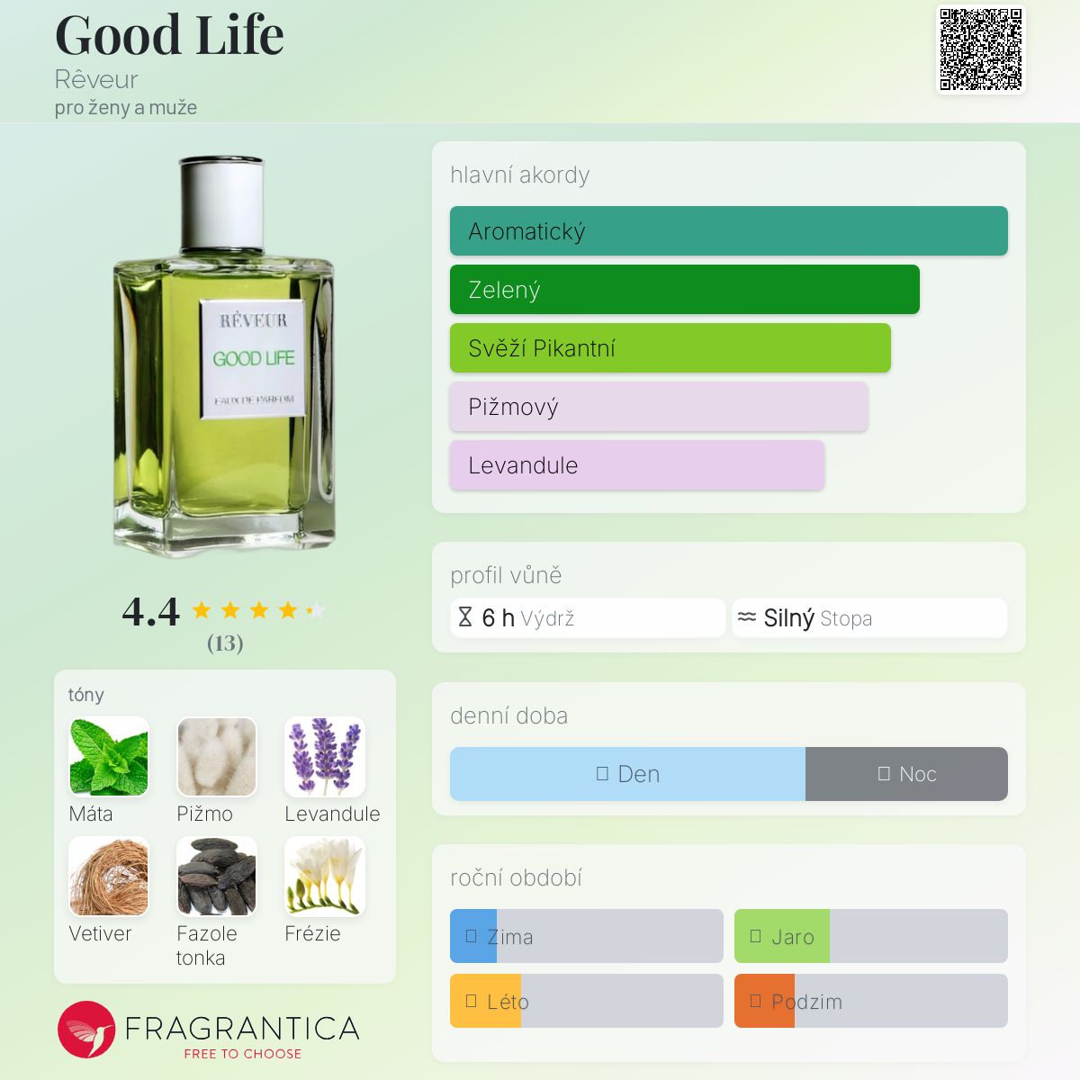 Good Life podle Rêveur je vůně pro ženy a muže. Good Life byl/a uveden/a v roce 2019. Vrchní tóny jsou Máta, Levandule a Vetiver; střední tóny jsouFrézie, Muškátový oříšek a Pomerančový květ ; základní tóny jsou Bílé pižmo, Fazole tonka a Pačuli.