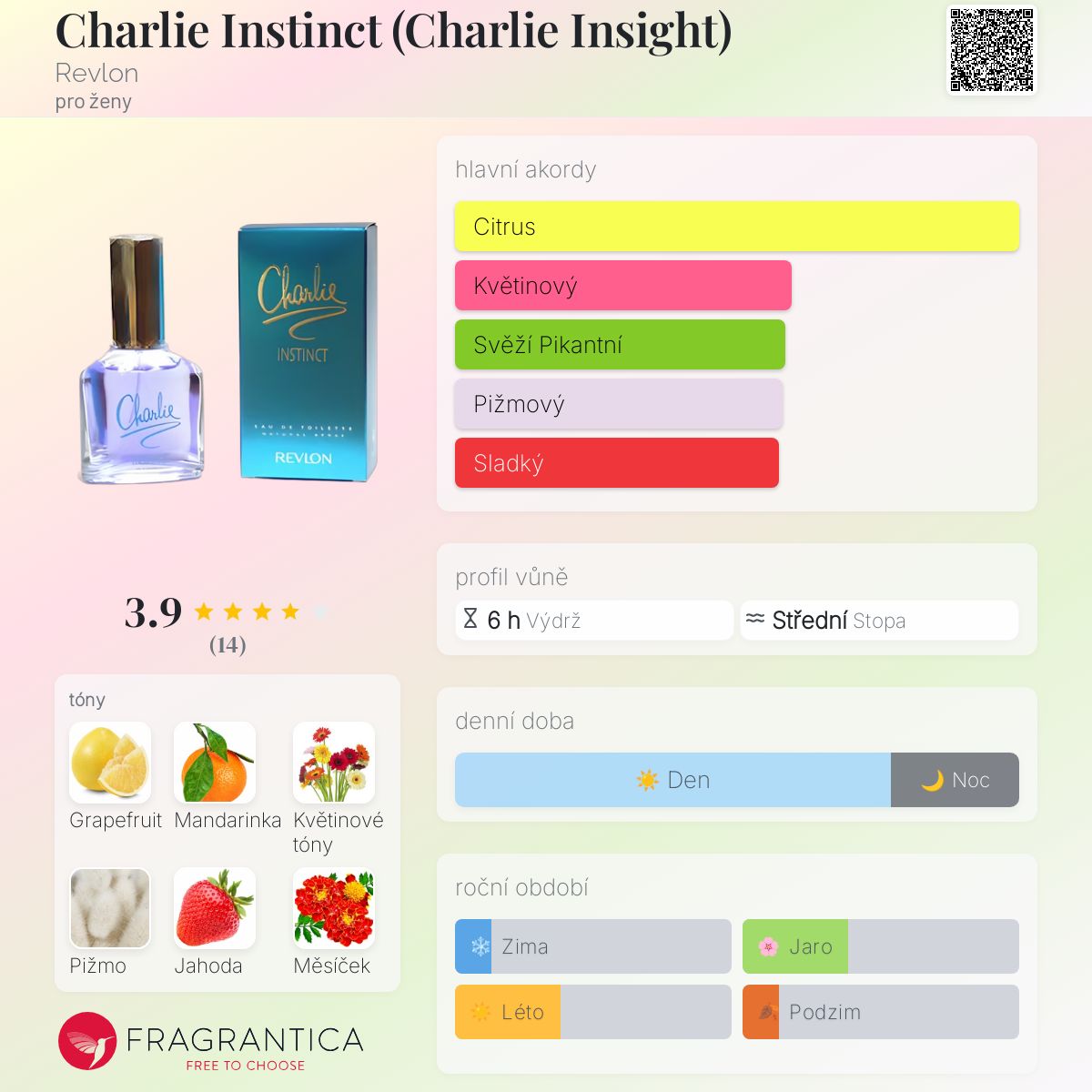 Charlie Instinct (Charlie Insight) podle Revlon je Floral Fruity vůně pro ženy. Charlie Instinct (Charlie Insight) byl/a uveden/a v roce 2000. Vrchní tóny jsou Grapefruit, Mandarinka, Velká jahoda a Růžový pepř; střední tóny jsouKvětinové tóny a Aksamitník ; základní tóny jsou Pižmo, Dřevité tóny a Pryskyřice.