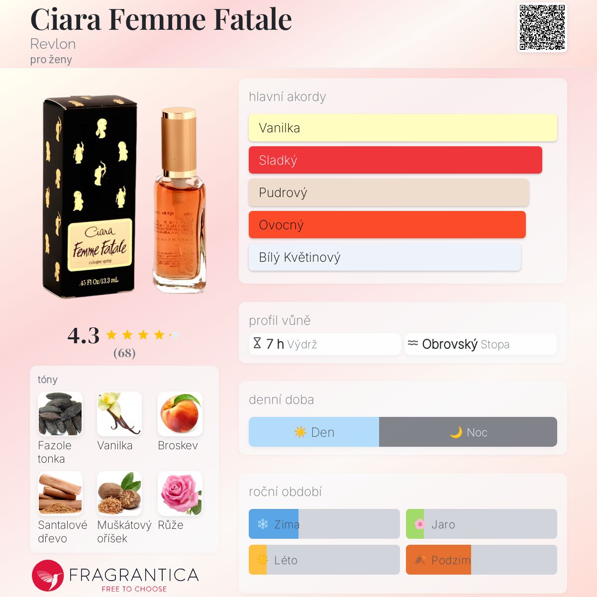 Ciara Femme Fatale podle Revlon je Orientální Floral vůně pro ženy. Ciara Femme Fatale byl/a uveden/a v roce 1995. Vrchní tóny jsou Broskev, Mandarinka, Brambořík, Hruška a Konvalinka; střední tóny jsouMuškátový oříšek, Růže, Květ afrického pomeranče a Jasmín ; základní tóny jsou Fazole tonka, Vanilka, Santalové dřevo a Pižmo.