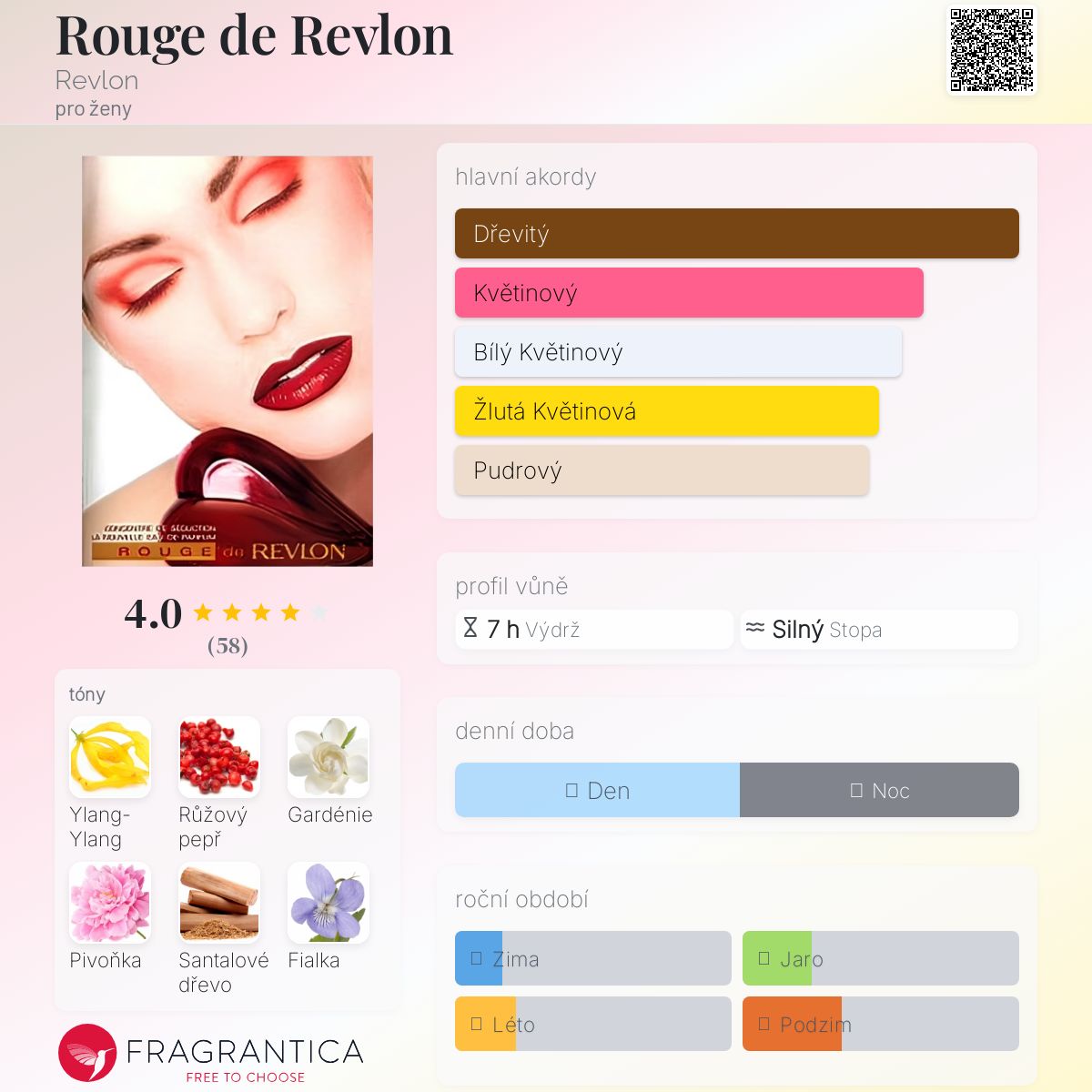 Rouge de Revlon podle Revlon je Floral Green vůně pro ženy. Rouge de Revlon byl/a uveden/a v roce 2000. "Nosem" za touto vůní je Judith Cross. Vrchní tóny jsou Ylang-Ylang a Bergamot; střední tóny jsouGardénie, Červená pivoňka, Fialka, Růže a Konvalinka ; základní tóny jsou Růžový pepř, Santalové dřevo, Cedr a Broskev.