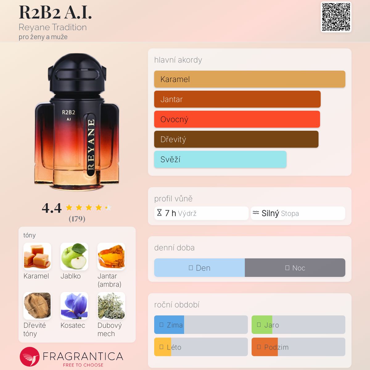 R2B2 A.I. podle Reyane Tradition je vůně pro ženy a muže. R2B2 A.I. byl/a uveden/a v roce 2023. Vrchní tóny jsou Karamel a Jablko; střední tóny jsouBílé dřevo, Dubový mech a Pepř ; základní tóny jsou Jantar (ambra) a Kosatec.
