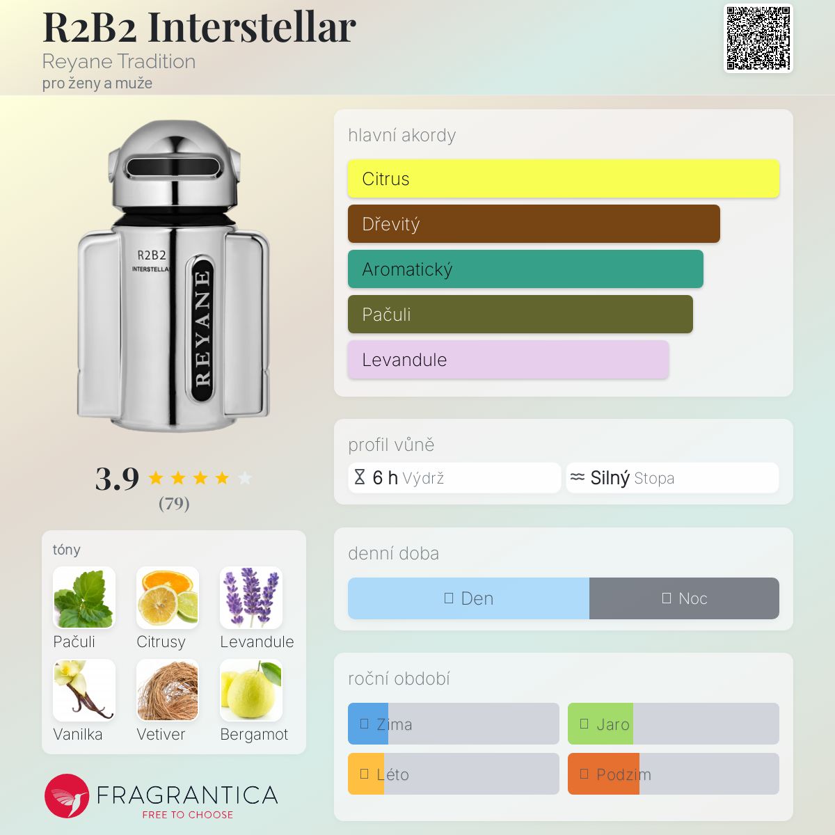 R2B2 Interstellar podle Reyane Tradition je vůně pro ženy a muže. R2B2 Interstellar byl/a uveden/a v roce 2023. Vrchní tóny jsou Citrusy a Bergamot; střední tón jeLevandule ; základní tóny jsou Pačuli, Vanilka, Vetiver a Jantar (ambra).