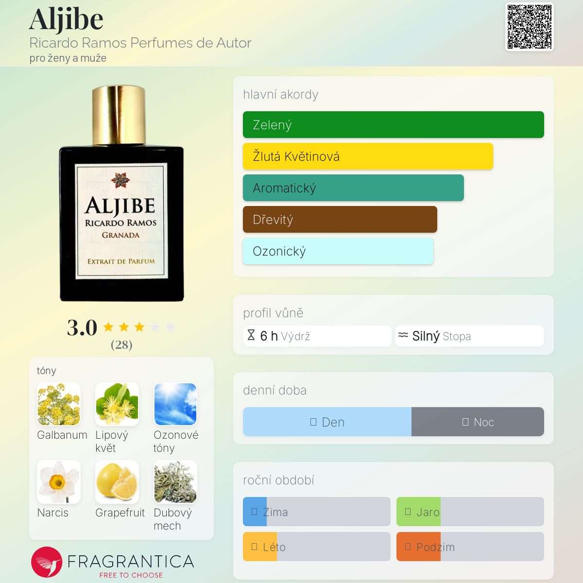 Aljibe podle Ricardo Ramos Perfumes de Autor je vůně pro ženy a muže. Aljibe byl/a uveden/a v roce 2017. "Nosem" za touto vůní je Jorge Lee. Vrchní tóny jsou Galbanum, Ozonové tóny a Grapefruit; střední tóny jsouLipový květ, Narcis a Hyacint ; základní tóny jsou Dubový mech, Haitský vetiver, Atlasový cedr a Ambra.