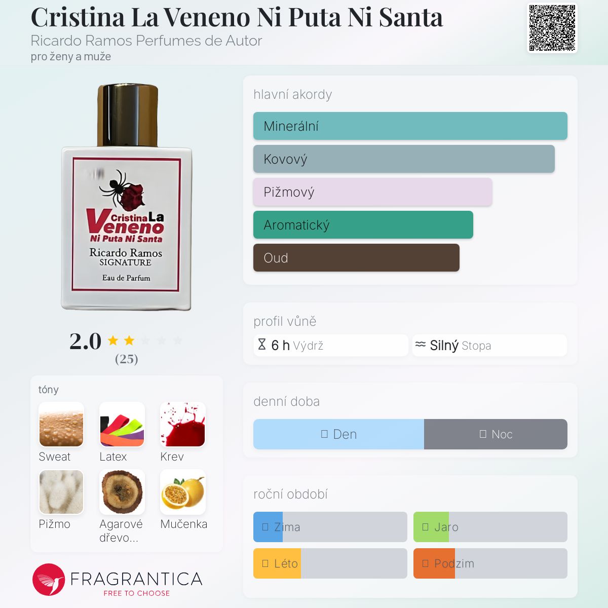 Cristina La Veneno Ni Puta Ni Santa podle Ricardo Ramos Perfumes de Autor je Floral Woody Musk vůně pro ženy a muže. Cristina La Veneno Ni Puta Ni Santa byl/a uveden/a v roce 2023. "Nosem" za touto vůní je Ricardo Ramos. Vrchní tóny jsou Pot, Mučenka a Muškátový květ; střední tóny jsouLatex, Krev, Pryskyřice elimi a Šafrán ; základní tóny jsou Pižmo, Agarové dřevo (oud), Olibanum, Guajakové dřevo a Madagaskarská vanilka.