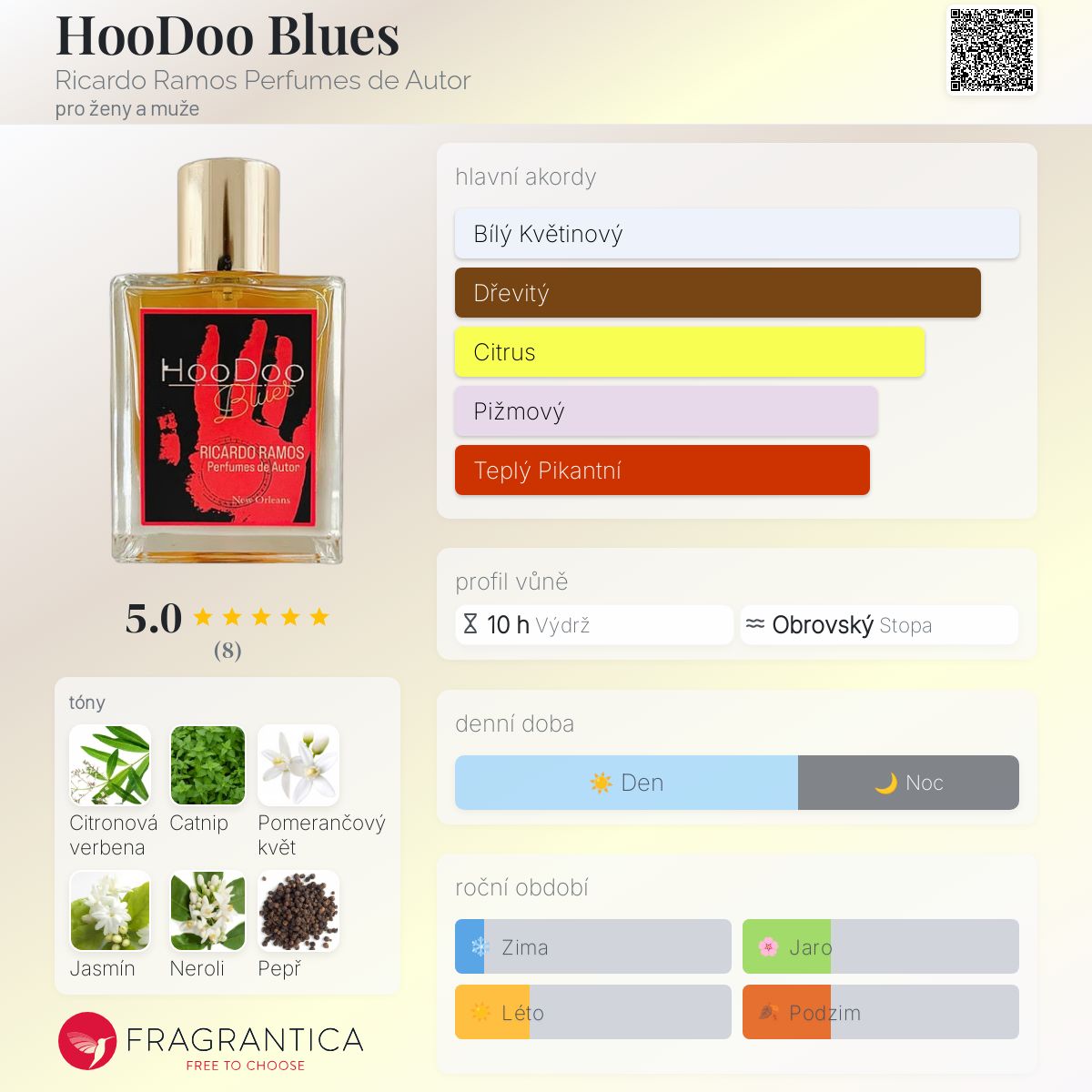 HooDoo Blues podle Ricardo Ramos Perfumes de Autor je Aromatic Green vůně pro ženy a muže. HooDoo Blues byl/a uveden/a v roce 2023. HooDoo Blues byl/a vytvořen/a Ricardo Ramos a Jorge Lee. Vrchní tóny jsou Sporýš, Šanta a Pomerančový květ; střední tóny jsouJasmín Sambac, Neroli, Černý pepř, Hřebíček a Vetiver ; základní tóny jsou Virginský cedr, Mandragora, Kastoreum a Pižmo.