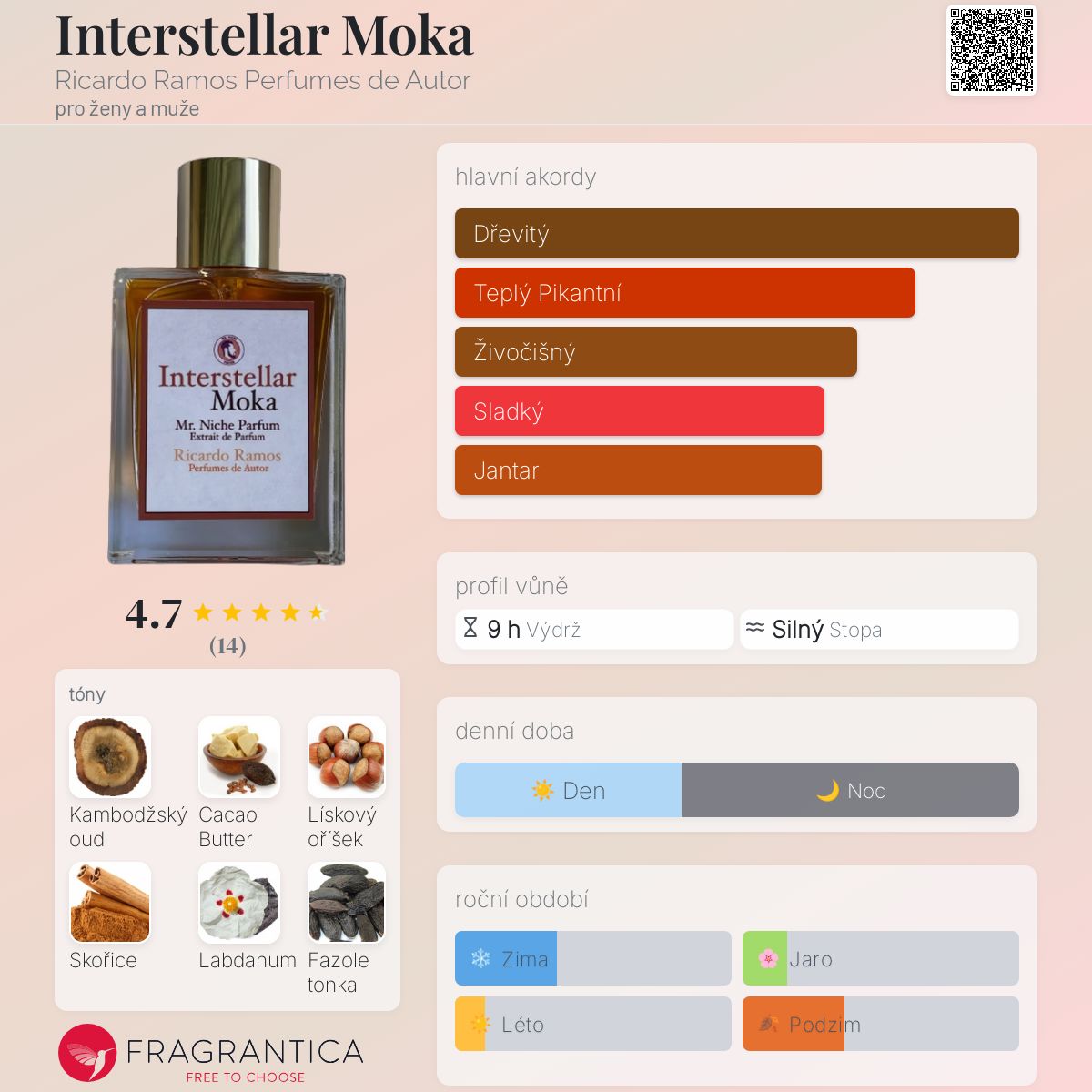 Interstellar Moka podle Ricardo Ramos Perfumes de Autor je Orientální Spicy vůně pro ženy a muže. Interstellar Moka byl/a uveden/a v roce 2022. Interstellar Moka byl/a vytvořen/a Ricardo Ramos a Jorge Lee. Vrchní tóny jsou Kakaové máslo, Lískový oříšek, Švestka a Myrta; střední tóny jsouSkořice, Káva, Plumérie, Muškátový oříšek a Orchidej ; základní tóny jsou Kambodžský oud, Labdanum, Fazole tonka, Pižmo a Madagaskarská vanilka.