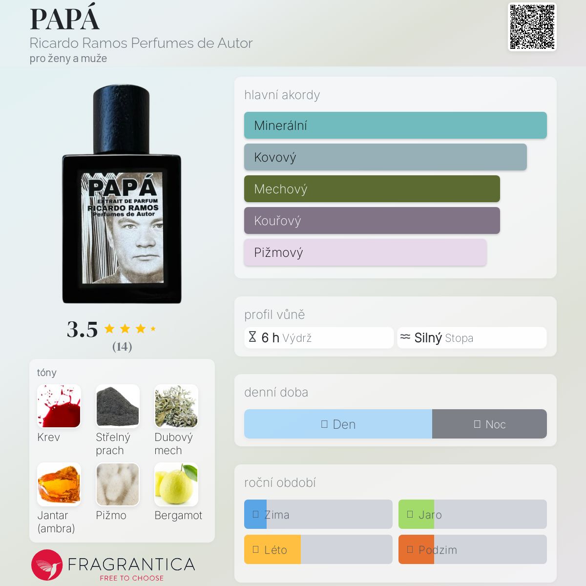 PAPÁ podle Ricardo Ramos Perfumes de Autor je Aromatic Fougere vůně pro ženy a muže. Toto je nová vůně. PAPÁ byl/a uveden/a v roce 2025. "Nosem" za touto vůní je Ricardo Ramos. Vrchní tóny jsou Střelný prach, Bergamot, Bazalka a Šalvěj; střední tóny jsouFazole tonka, Levandule, Pelargónie a Guayacan ; základní tóny jsou Krev, Dubový mech, Jantar (ambra) a Pižmo.