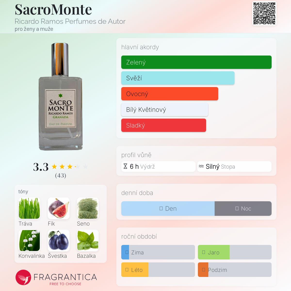 SacroMonte podle Ricardo Ramos Perfumes de Autor je Aromatic Fruity vůně pro ženy a muže. SacroMonte byl/a uveden/a v roce 2016. "Nosem" za touto vůní je Jorge Lee. Vrchní tóny jsou Tráva, Fík a Bazalka; střední tóny jsouKonvalinka, Švestka, Černý jantar a Jasmín ; základní tóny jsou Seno, Bílé pižmo a Jantar (ambra).