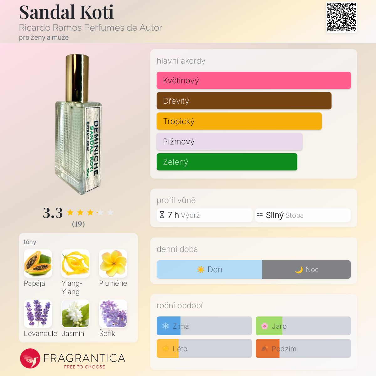 Sandal Koti podle Ricardo Ramos Perfumes de Autor je Woody vůně pro ženy a muže. Sandal Koti byl/a uveden/a v roce 2020. Sandal Koti byl/a vytvořen/a Ricardo Ramos a Jorge Lee. Vrchní tóny jsou Papája, Ylang-Ylang, Plumérie a Levandule; střední tóny jsouJasmín Sambac, Šeřík, Santalové dřevo a Galbanum ; základní tóny jsou Dubový mech, Labdanum a Pižmo.