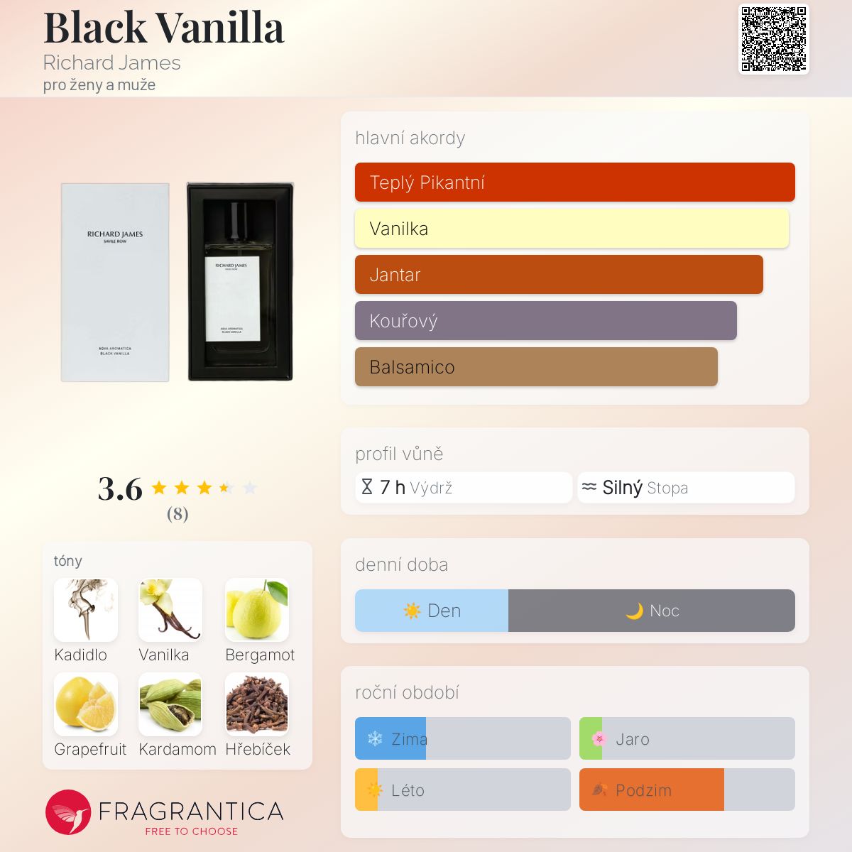 Black Vanilla podle Richard James je Orientální Vanilla vůně pro ženy a muže. Black Vanilla byl/a uveden/a v roce 2020. "Nosem" za touto vůní je Alain Verjus. Vrchní tóny jsou Bergamot, Grapefruit a Kardamom; střední tóny jsouKadidlo a Hřebíček ; základní tóny jsou Vanilka, Pačuli, Cedr a Pižmo.