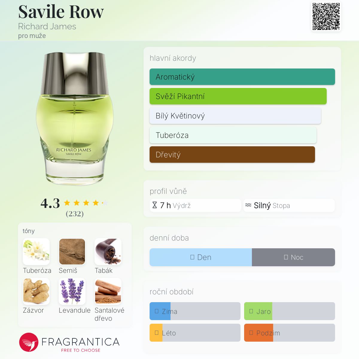 Savile Row podle Richard James je Aromatic Fougere vůně pro muže. Savile Row byl/a uveden/a v roce 2003. "Nosem" za touto vůní je Yves Cassar. Vrchní tóny jsou Zázvor, Bergamot, Zelený čaj, Rozmarýn, Mandarinka, Bazalka a Petitgrain; střední tóny jsouTuberóza, Levandule, Růže, Konvalinka, Kardamom a Koriandr ; základní tóny jsou Semiš, Tabák, Santalové dřevo, Jantar (ambra), Vetiver, List indonéského pačuli, Dubový mech a Pižmo.