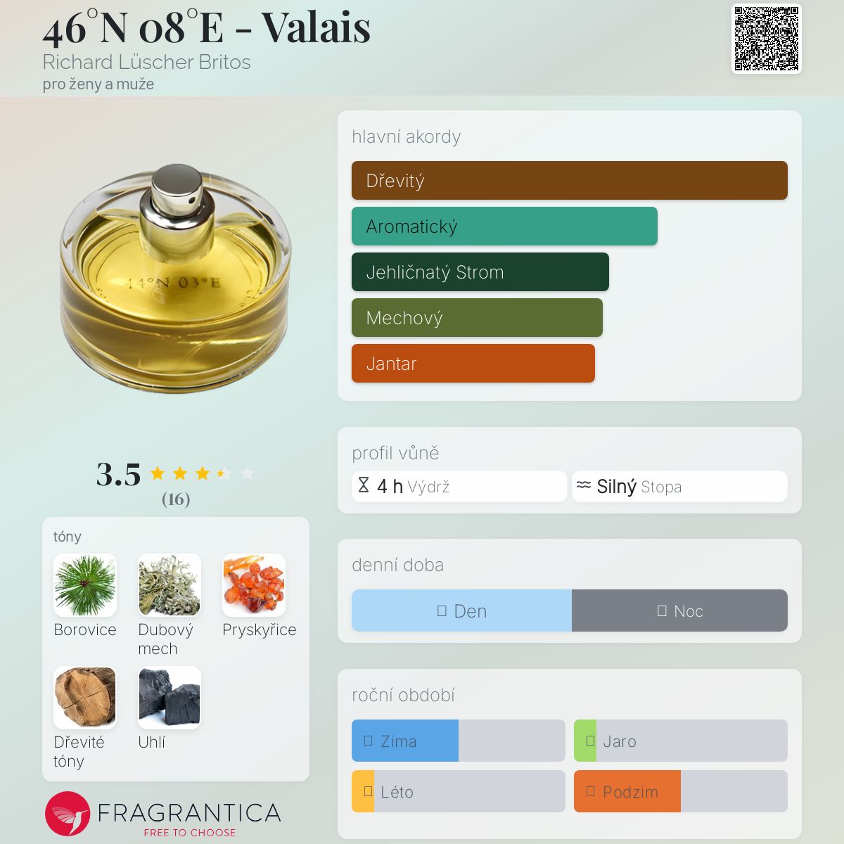 46°N 08°E - Valais podle Richard Lüscher Britos je Woody Aromatic vůně pro ženy a muže. 46°N 08°E - Valais byl/a uveden/a v roce 2014. Vrchní tón je Jehličí borovice ; střední tóny jsouBorovice, Mech a Dřevité tóny ; základní tóny jsou Borovice, Pryskyřice a Uhlí.