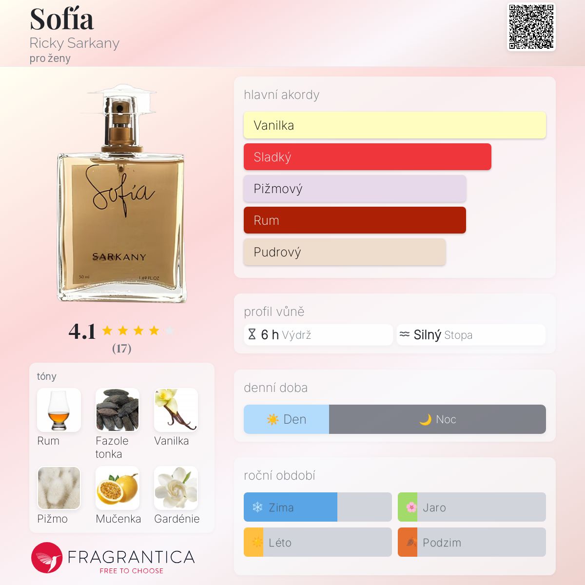 Sofía podle Ricky Sarkany je Orientální Floral vůně pro ženy. Sofía byl/a uveden/a v roce 2012. Vrchní tóny jsou Rum a Mučenka; střední tón jeGardénie ; základní tóny jsou Fazole tonka, Vanilka a Pižmo.