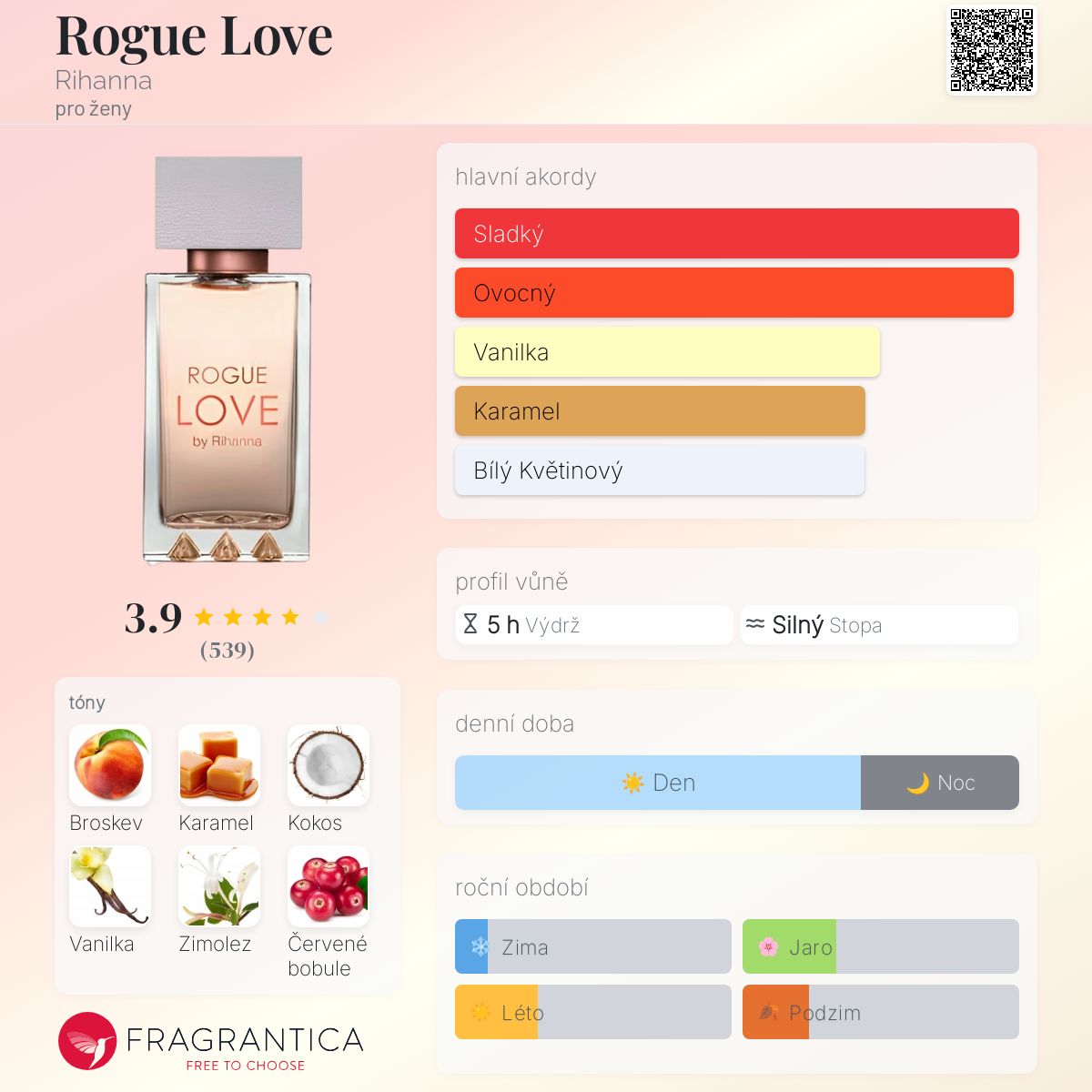 Rogue Love podle Rihanna je Floral Fruity Gourmand vůně pro ženy. Rogue Love byl/a uveden/a v roce 2014. Vrchní tóny jsou Broskev, Červené bobule a Mandarinka; střední tóny jsouKokos, Zimolez, Orchidej a Jasmín Sambac ; základní tóny jsou Karamel, Vanilka, Jantar (ambra) a Dřevité tóny.