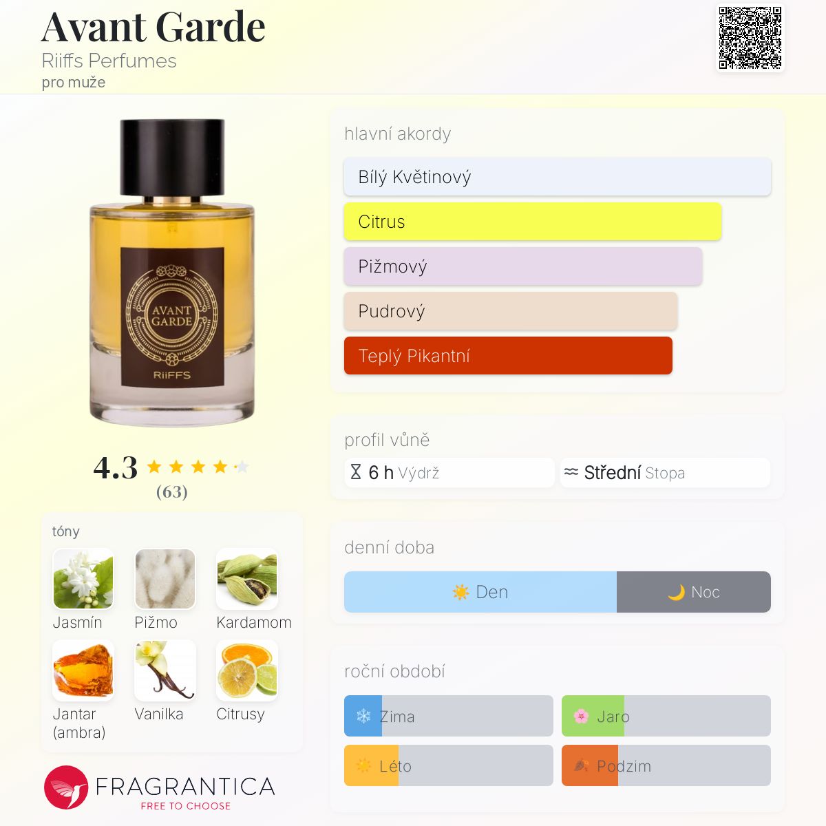 Avant Garde podle Riiffs Perfumes je Floral vůně pro muže. Avant Garde byl/a uveden/a v roce 2023. Vrchní tóny jsou Citrusy a Bergamot; střední tóny jsouJasmín a Kardamom ; základní tóny jsou Pižmo, Jantar (ambra) a Vanilka.