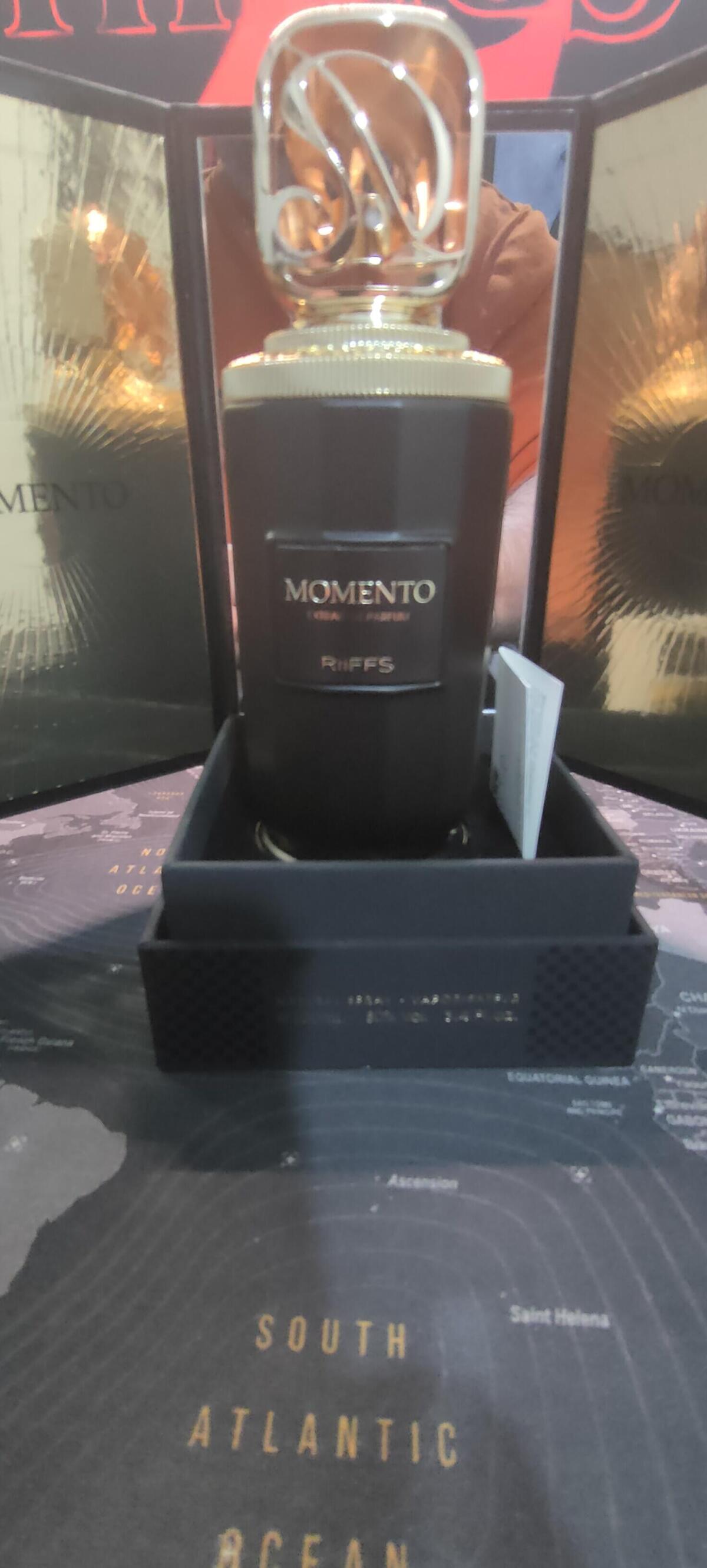 Momento podle Riiffs Perfumes je Woody Spicy vůně pro ženy a muže. Toto je nová vůně. Momento byl/a uveden/a v roce 2025. Vrchní tóny jsou Cukr, Šafrán a Mandarinka; střední tóny jsouFazole tonka, Damašská růže a Agarové dřevo (oud) ; základní tóny jsou Karamel, Jantarové dřevo a Cedr.