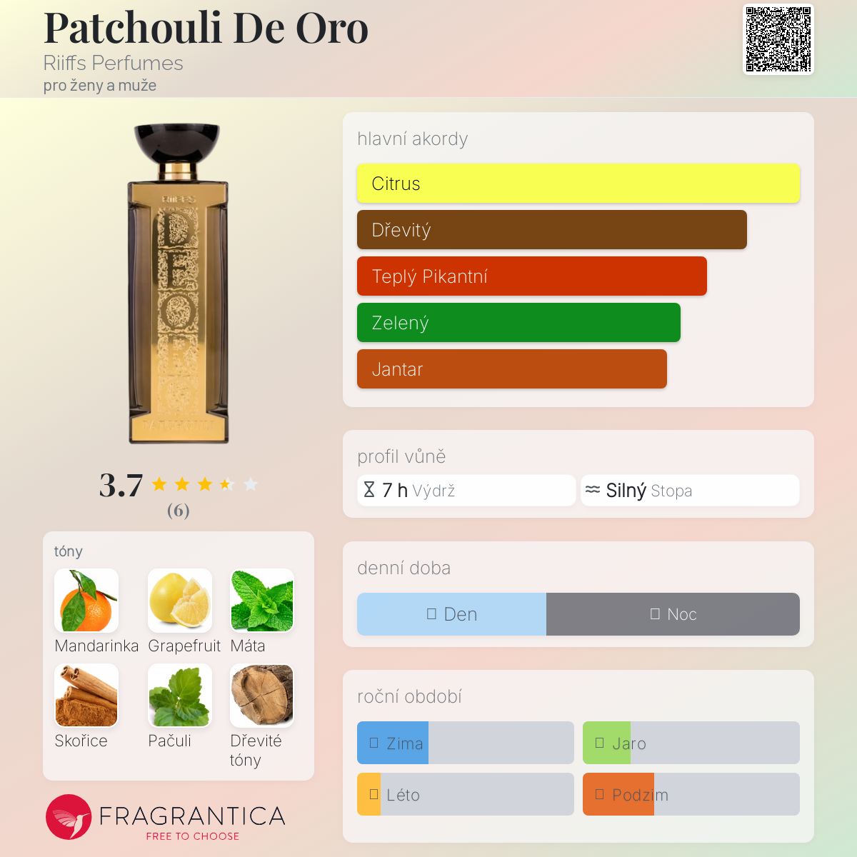 Patchouli De Oro podle Riiffs Perfumes je Leather vůně pro ženy a muže. Patchouli De Oro byl/a uveden/a v roce 2021. Vrchní tóny jsou Krvavá mandarinka, Grapefruit a Máta; střední tón jeSkořice ; základní tóny jsou Indické pačuli, Dřevité tóny, Kůže a Jantar (ambra).
