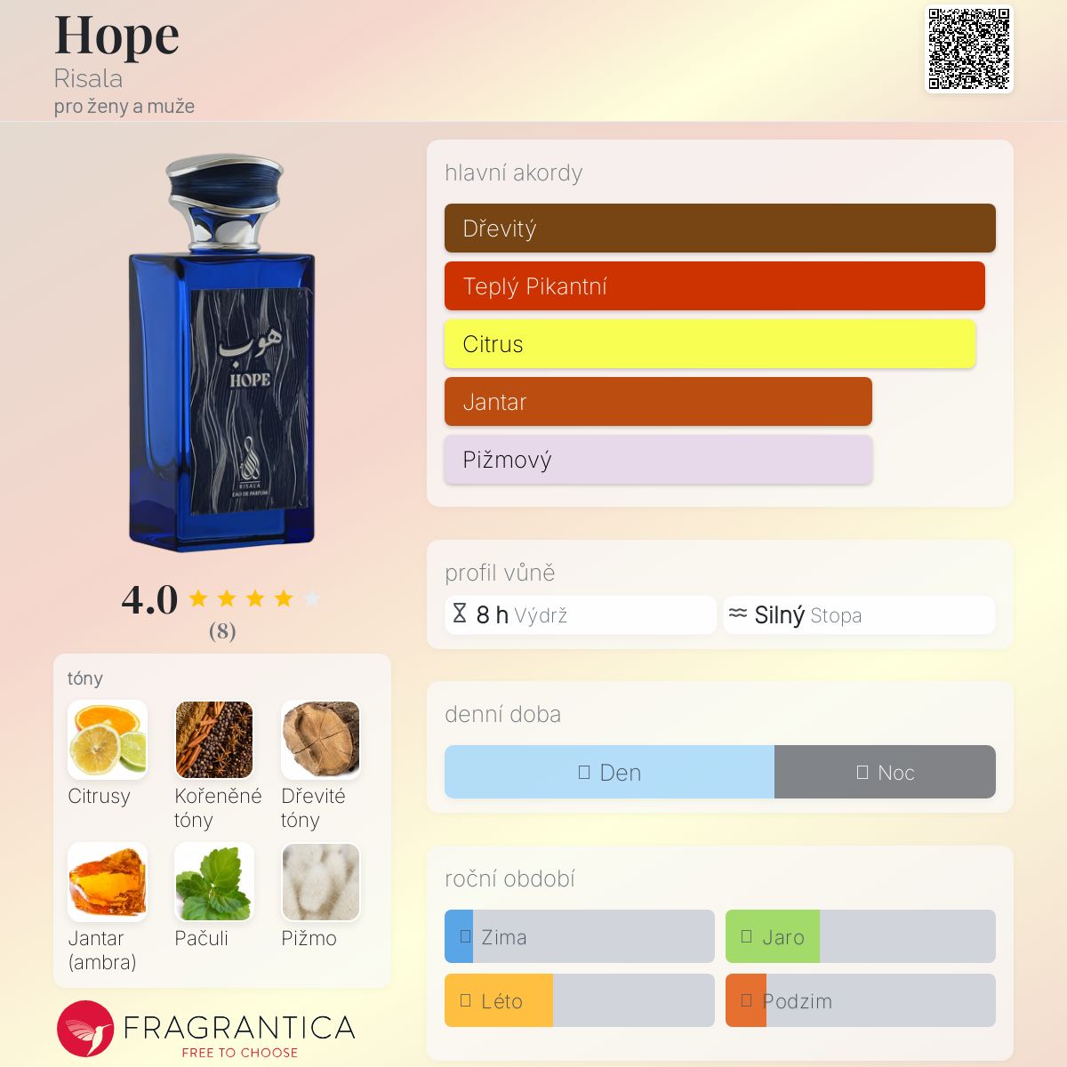 Hope podle Risala je Orientální Woody vůně pro ženy a muže. Toto je nová vůně. Hope byl/a uveden/a v roce 2024. Vrchní tón je Citrusy ; střední tóny jsouDřevité tóny a Jantar (ambra) ; základní tóny jsou Koření, Pačuli a Pižmo.
