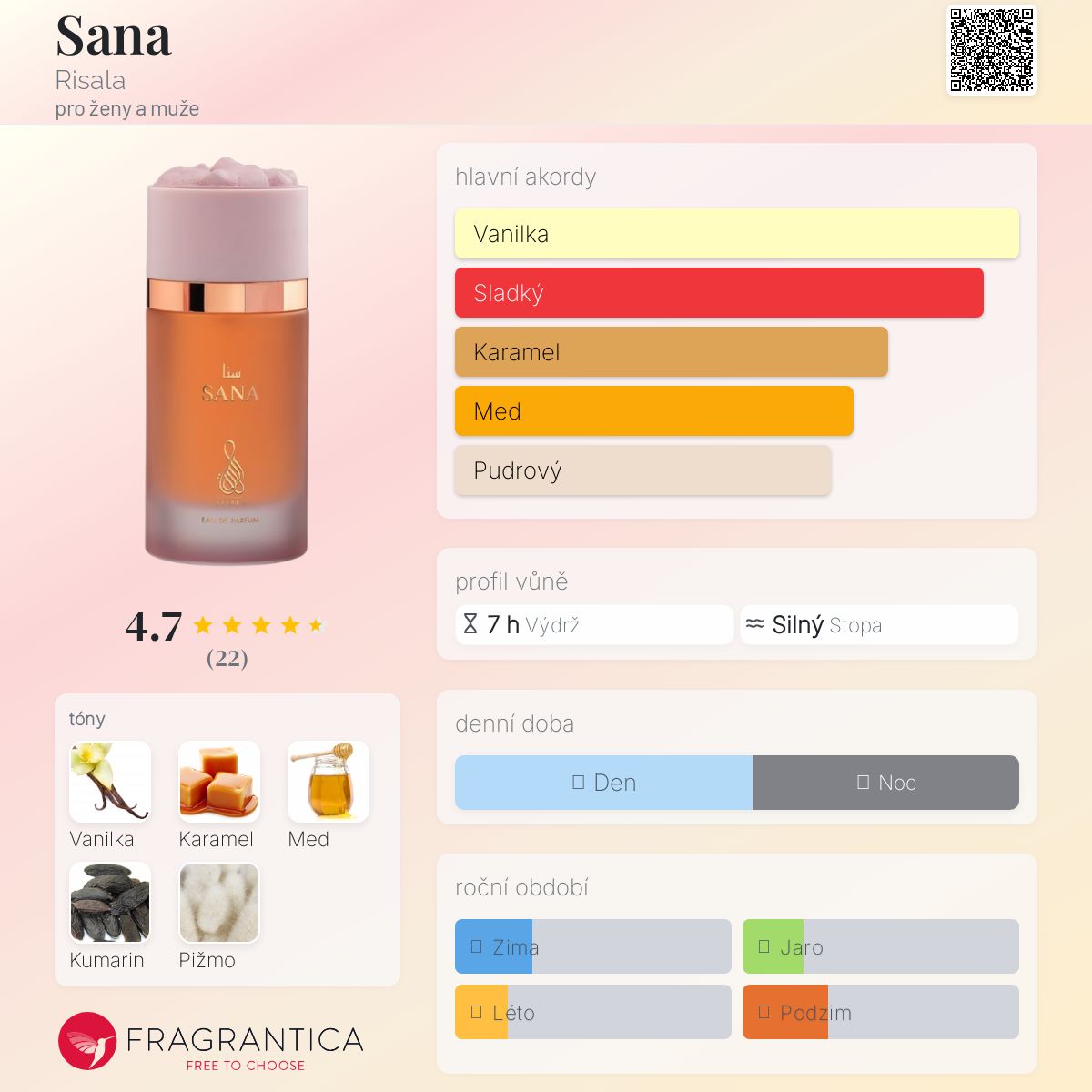 Sana podle Risala je Orientální Vanilla vůně pro ženy a muže. Toto je nová vůně. Sana byl/a uveden/a v roce 2024. Vrchní tón je Karamel ; střední tóny jsouMed a Kumarin ; základní tóny jsou Vanilka a Bílé pižmo.