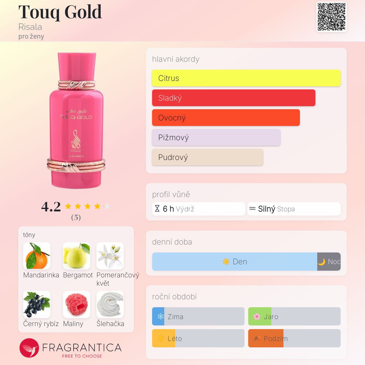 Touq Gold podle Risala je vůně pro ženy. Toto je nová vůně. Touq Gold byl/a uveden/a v roce 2024. Vrchní tóny jsou Mandarinka, Bergamot a Grapefruit; střední tóny jsouPomerančový květ, Černý rybíz a Maliny ; základní tóny jsou Šlehačka, Marshamallow, Pižmo a Ambrette (přírodní pižmo).