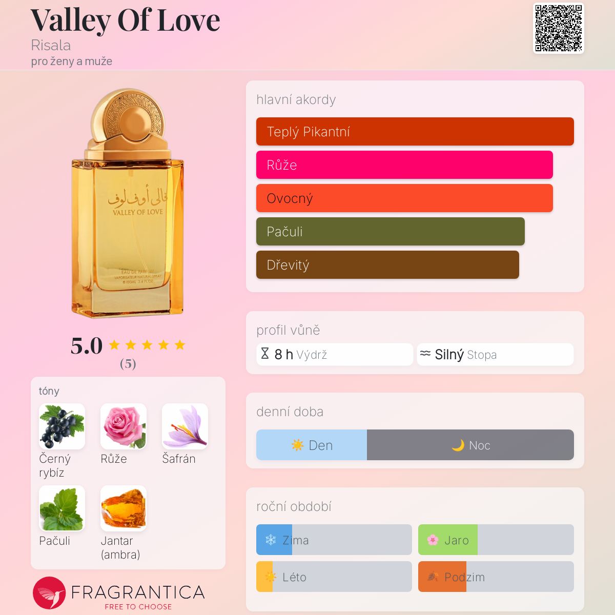 Valley Of Love podle Risala je Orientální Floral vůně pro ženy a muže. Toto je nová vůně. Valley Of Love byl/a uveden/a v roce 2024. Vrchní tóny jsou Černý rybíz a Šafrán; střední tón jeRůže ; základní tóny jsou Pačuli a Jantar (ambra).