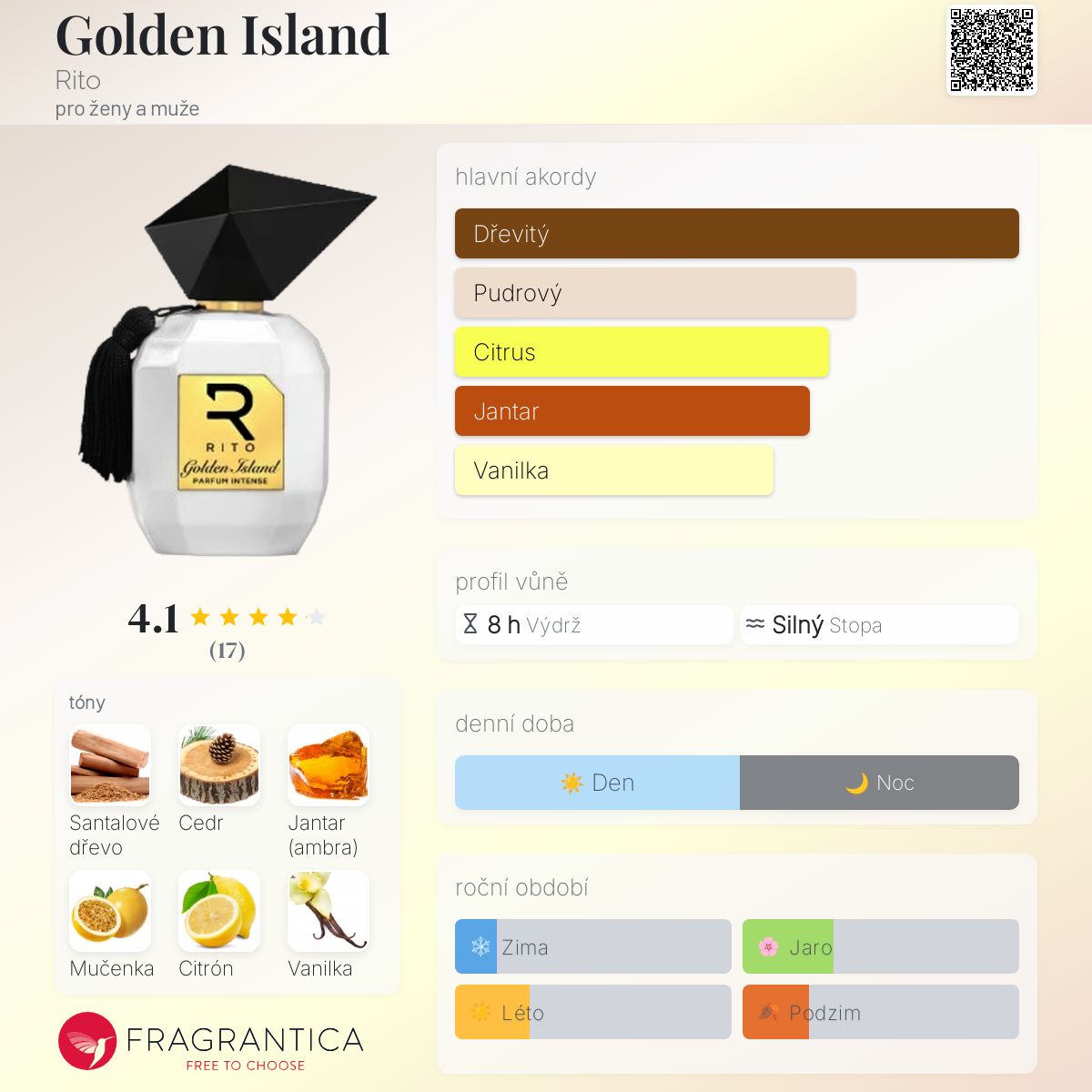 Golden Island podle Rito je Aromatic Fruity vůně pro ženy a muže. Toto je nová vůně. Golden Island byl/a uveden/a v roce 2024. "Nosem" za touto vůní je Chris Maurice. Vrchní tóny jsou Mučenka, Sicilský citron a Kalábrijský bergamot; střední tóny jsouAtlasový cedr, Květinové tóny a Myrta ; základní tóny jsou Santalové dřevo, Jantar (ambra) a Madagaskarská vanilka.