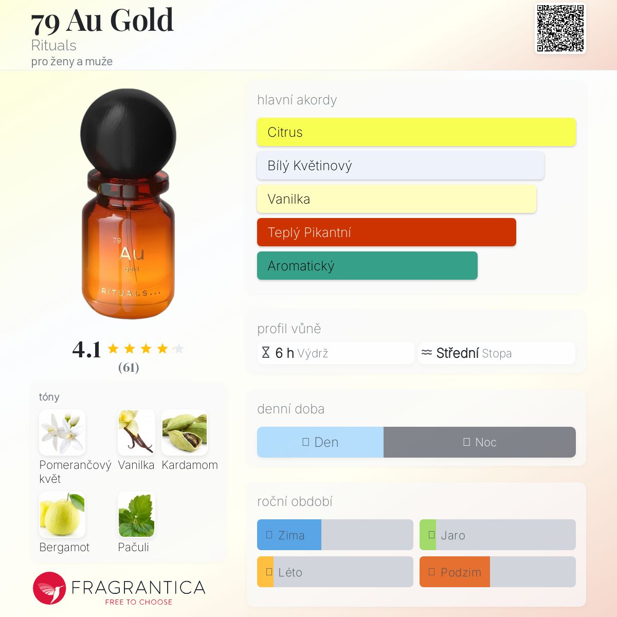 79 Au Gold podle Rituals je Orientální Vanilla vůně pro ženy a muže. Toto je nová vůně. 79 Au Gold byl/a uveden/a v roce 2024. Vrchní tóny jsou Kardamom a Bergamot; střední tón jePomerančový květ ; základní tóny jsou Vanilka a Pačuli.